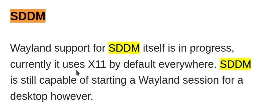 O suporte do Wayland para SDDM está em andamento, atualmente ele usa o X11 por padrão em todos os lugares. Contudo, SDDM ainda é capaz de iniciar uma sessão do Wayland para um desktop.