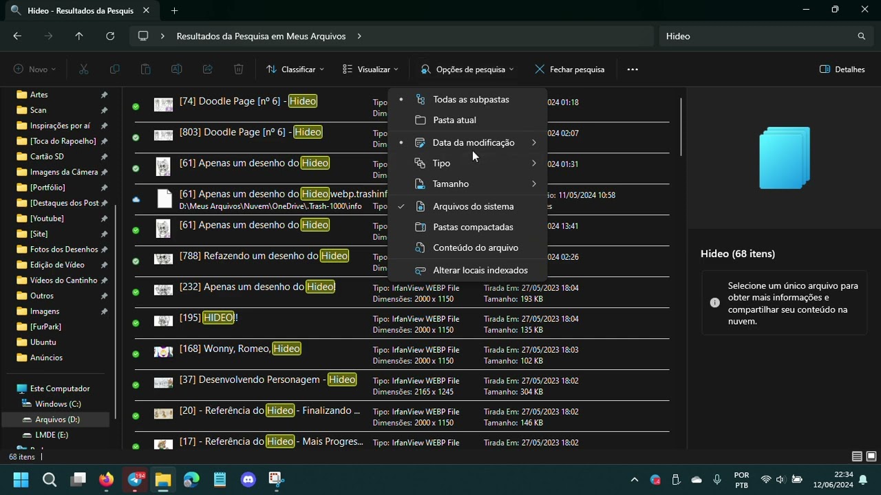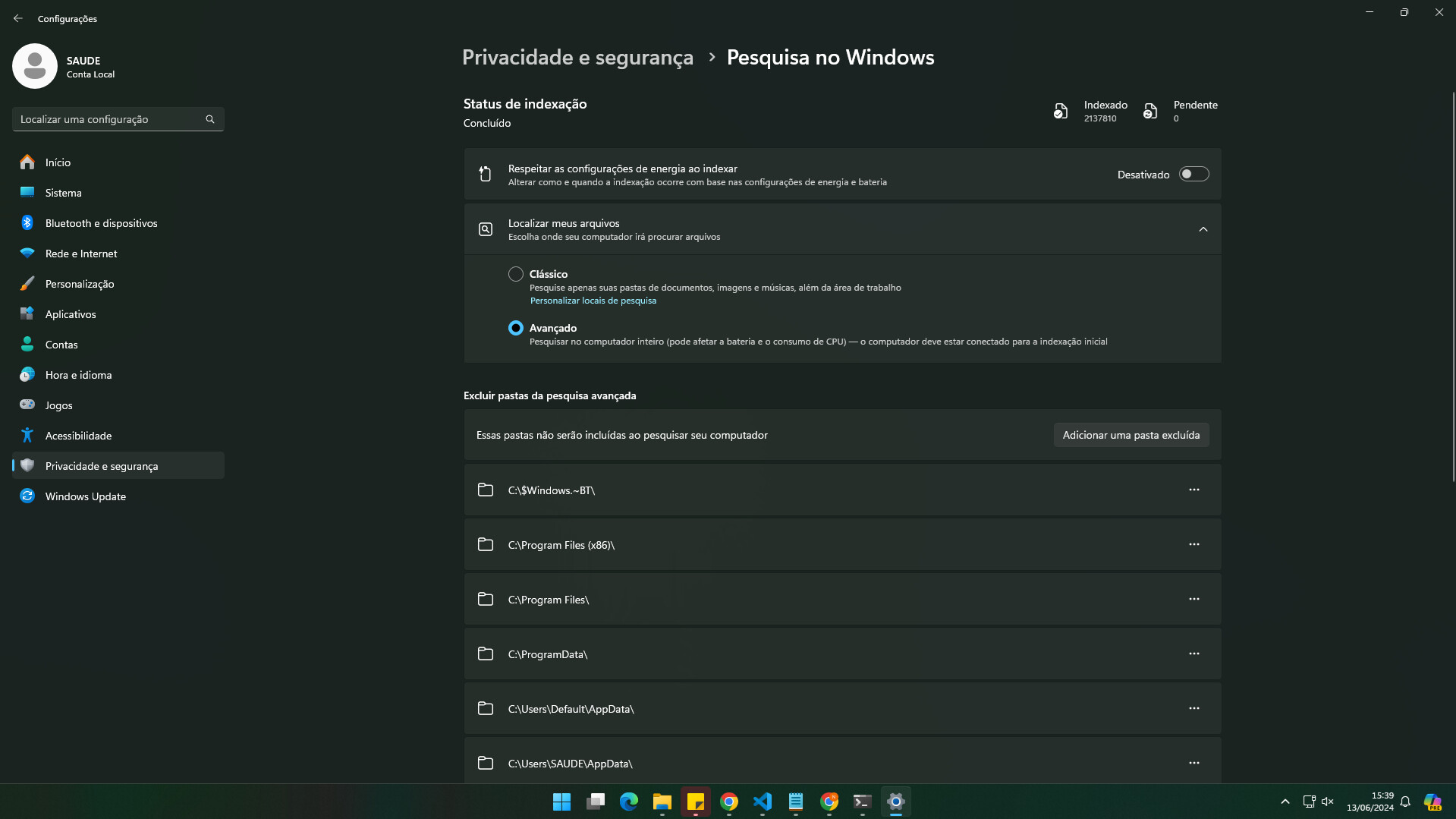 - A busca também foi feita enquanto a Indexação estava sendo feita, devido a ter usado o “Liberar espaço em disco” do Onedrive em algumas pastas, o que alterou a propriedade de milhares de arquivos.
