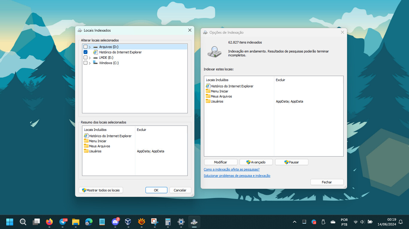 - Da partição D:\ apenas a pasta “Meus Arquivos” está indexada, pois é nela onde concentro a maior parte dos meus arquivos. De resto, a Indexação está em suas configurações normais.