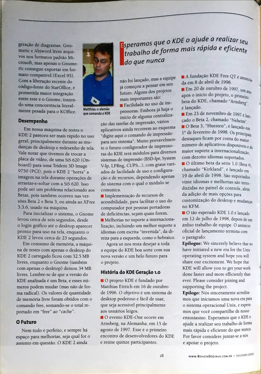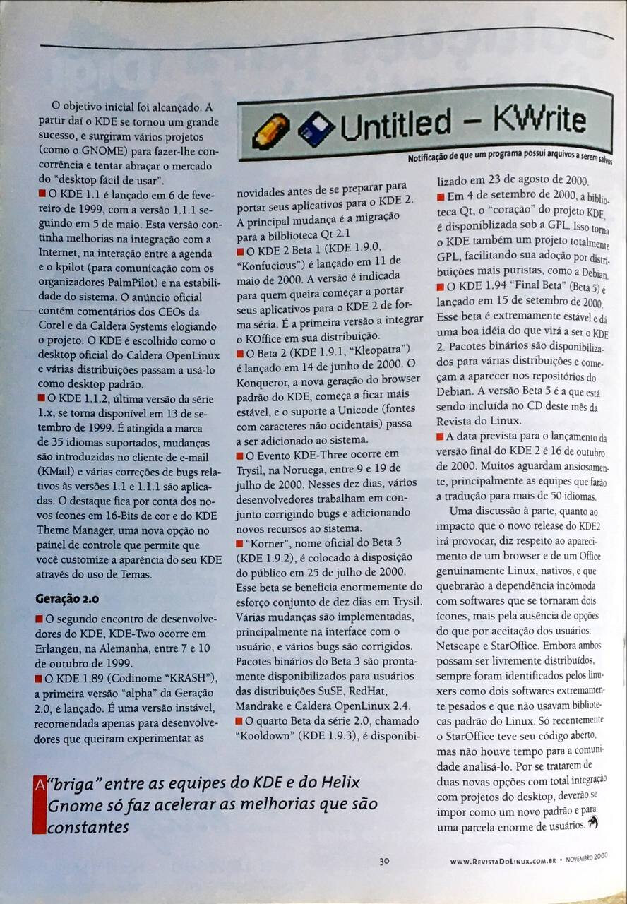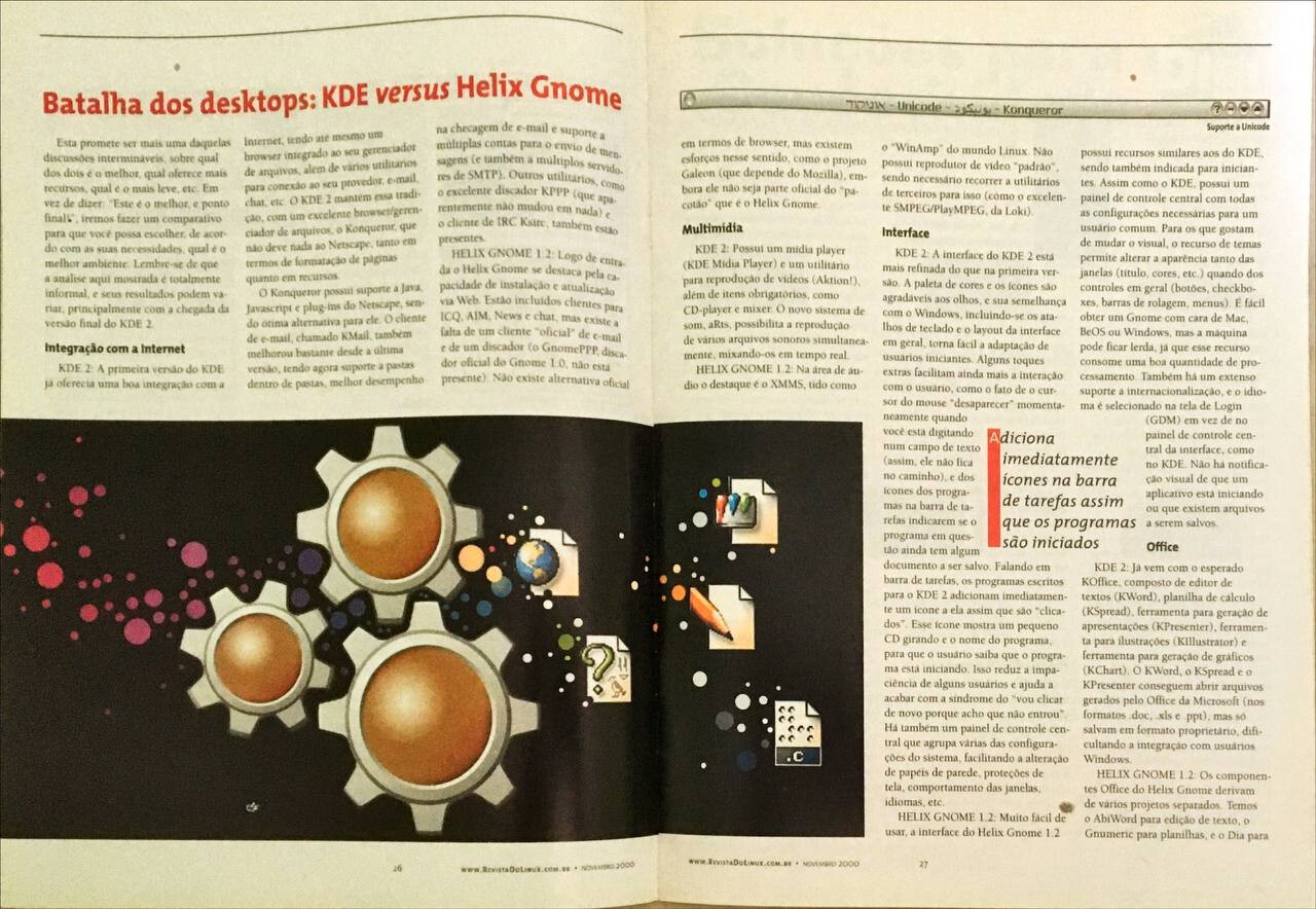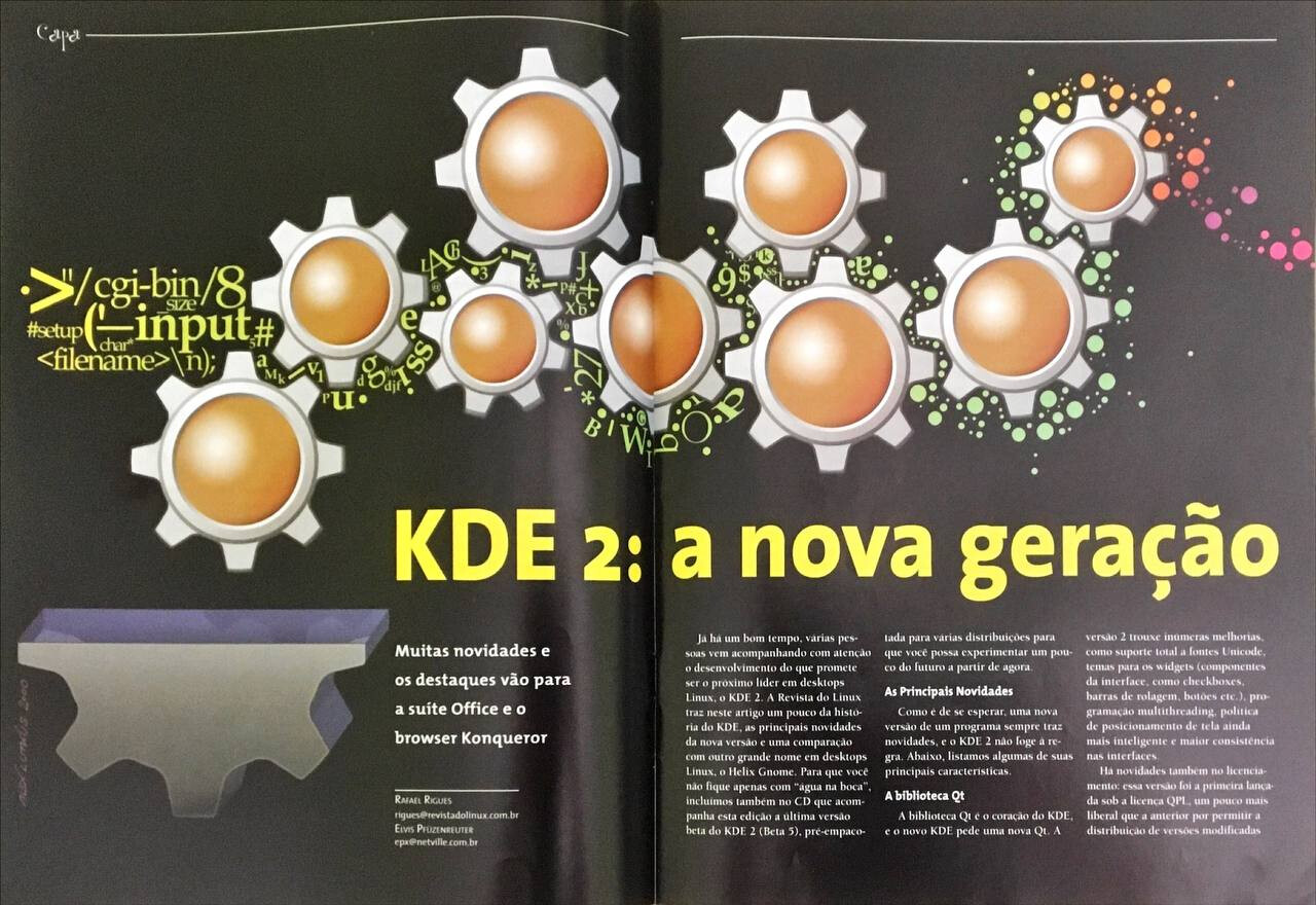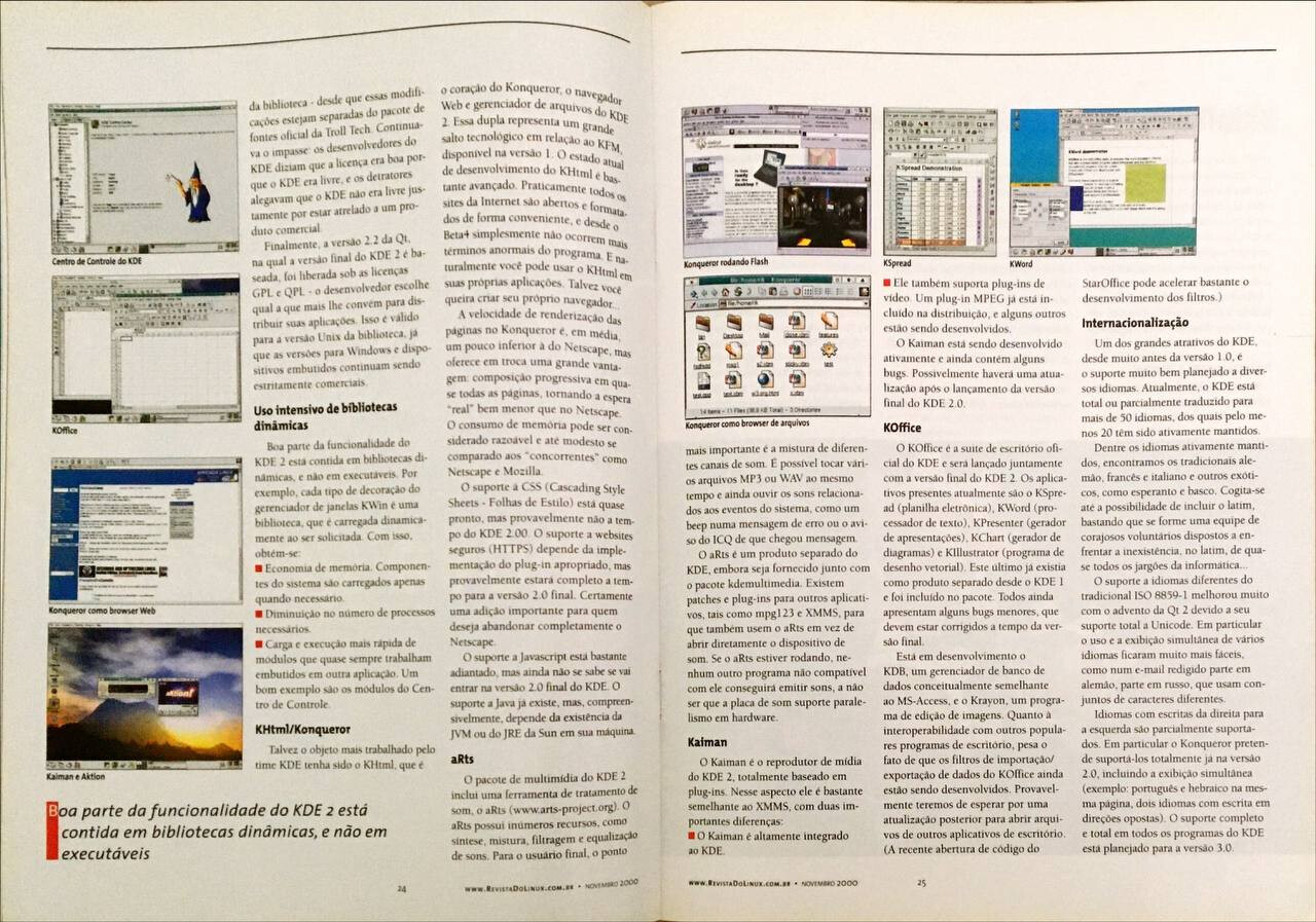 Decidi dar uma olhada na minha biblioteca e digitalizei a reportagem de capa da edição 11 da Revista do Linux. O lançamento do KDE 2 era uma das coisas mais esperadas naquele momento. Há menções ao Konqueror também. A reportagem pode ser lida online no site do Augusto, mas sem figuras.