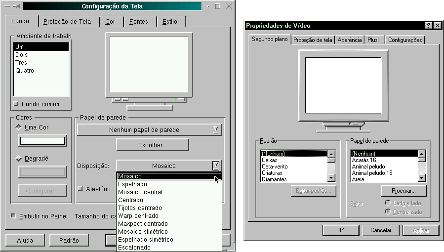 Um exemplo simples para comparação: disposição do papel de parede. Do lado esquerdo, temos o KDE, que possui desktops virtuais com papel de parede independente ou unificado, além de mais opções para dispor as imagens. No Windows NT 4.0, o único concorrente realista para um Linux da época com KDE, o usuário pode escolher um padrão monocromático ou dispor uma imagem de duas formas diferentes (lado a lado ou centralizada). O KDE também tinha a opção de randomizar o papel de parede.