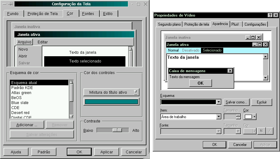 Um exemplo de similaridade inegável é a configuração do esquema de cores. O KDE se inspirou claramente no Windows 9x/NT, no entanto, não há realmente uma forma muito diferente de fazer isso.