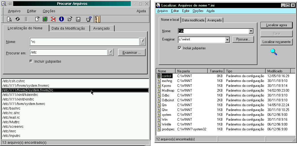 Outro exemplo está na ferramenta de busca de arquivos. Muito parecida com a oferecida pelo Windows na época. Até a disposição dos elementos era idêntica. E, enquanto o KDE oferecia uma barra de ferramentas, o Windows oferecia uma ferramenta muito mais sinérgica em relação ao gerenciador de arquivos (Explorer). Do lado do KDE, não havia menu contextual para essa ferramenta de procura de arquivos.