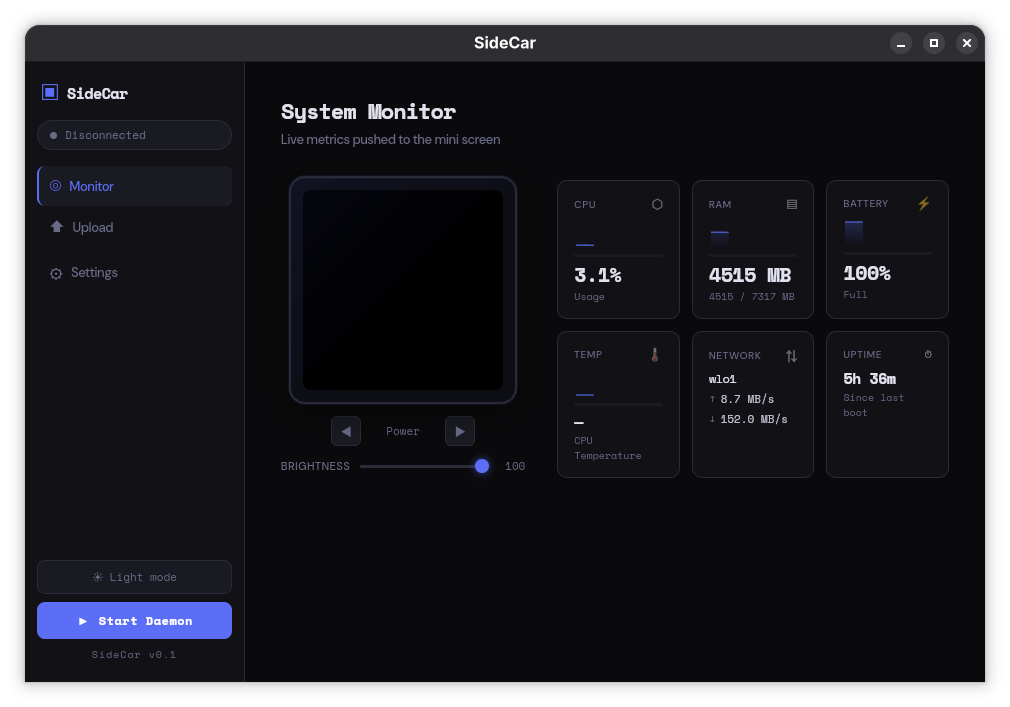 O SideCar é uma aplicação em estado beta que surge como uma alternativa não oficial para interagir com a mini tela presente no notebook Positivo Vision R15M. A proposta do projeto é permitir que usuários e desenvolvedores explorem, controlem e integrem funcionalidades personalizadas nessa tela auxiliar, expandindo o potencial do hardware além do uso originalmente previsto.