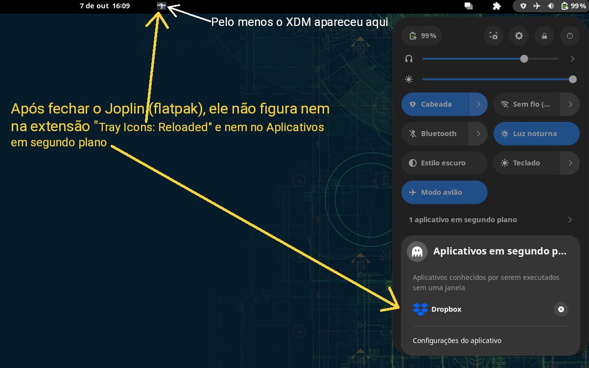 Por outro lado, observando o que foi comentado por @eddiecsilva e @henriquead7, decidi instalar o Dropbox (flatpak) que também uso e… ok, o Dropbox apareceu no Menu de status - “aplicativos em segundo plano.”
