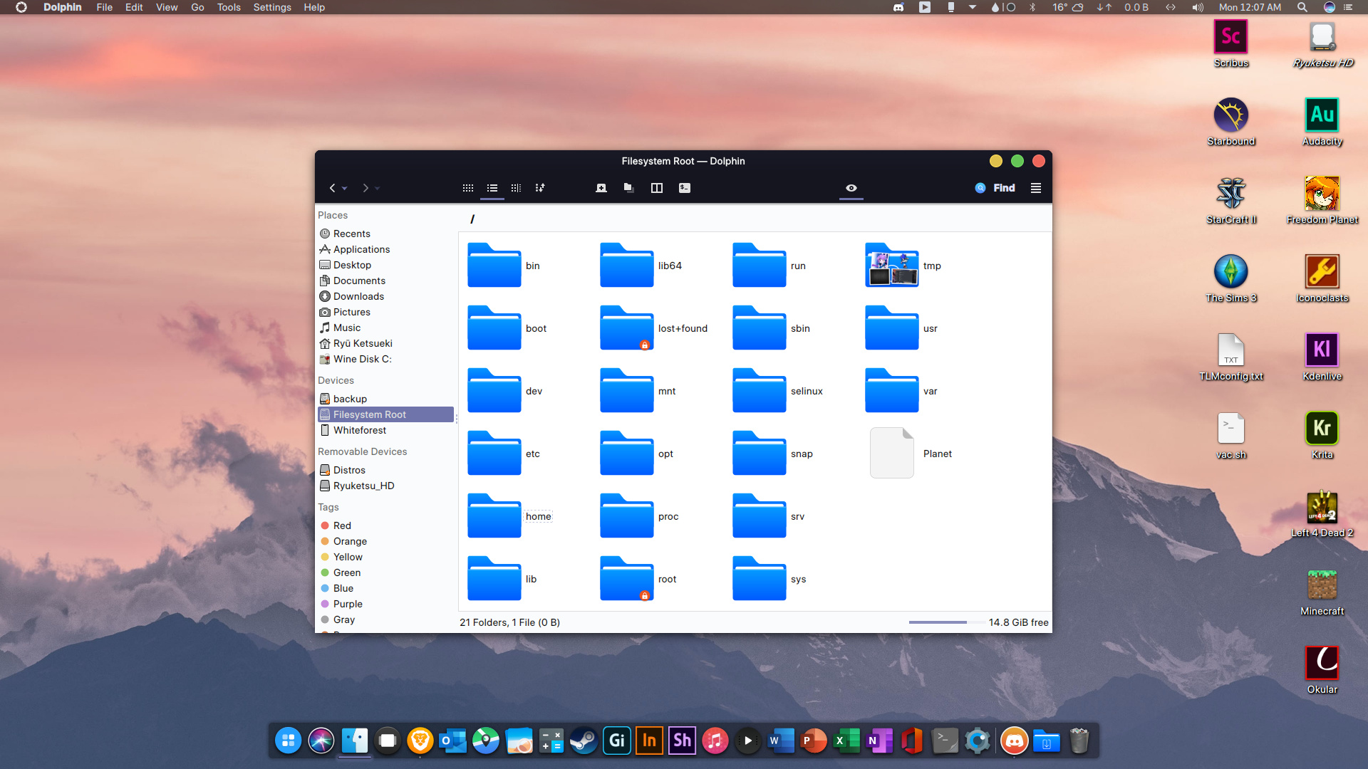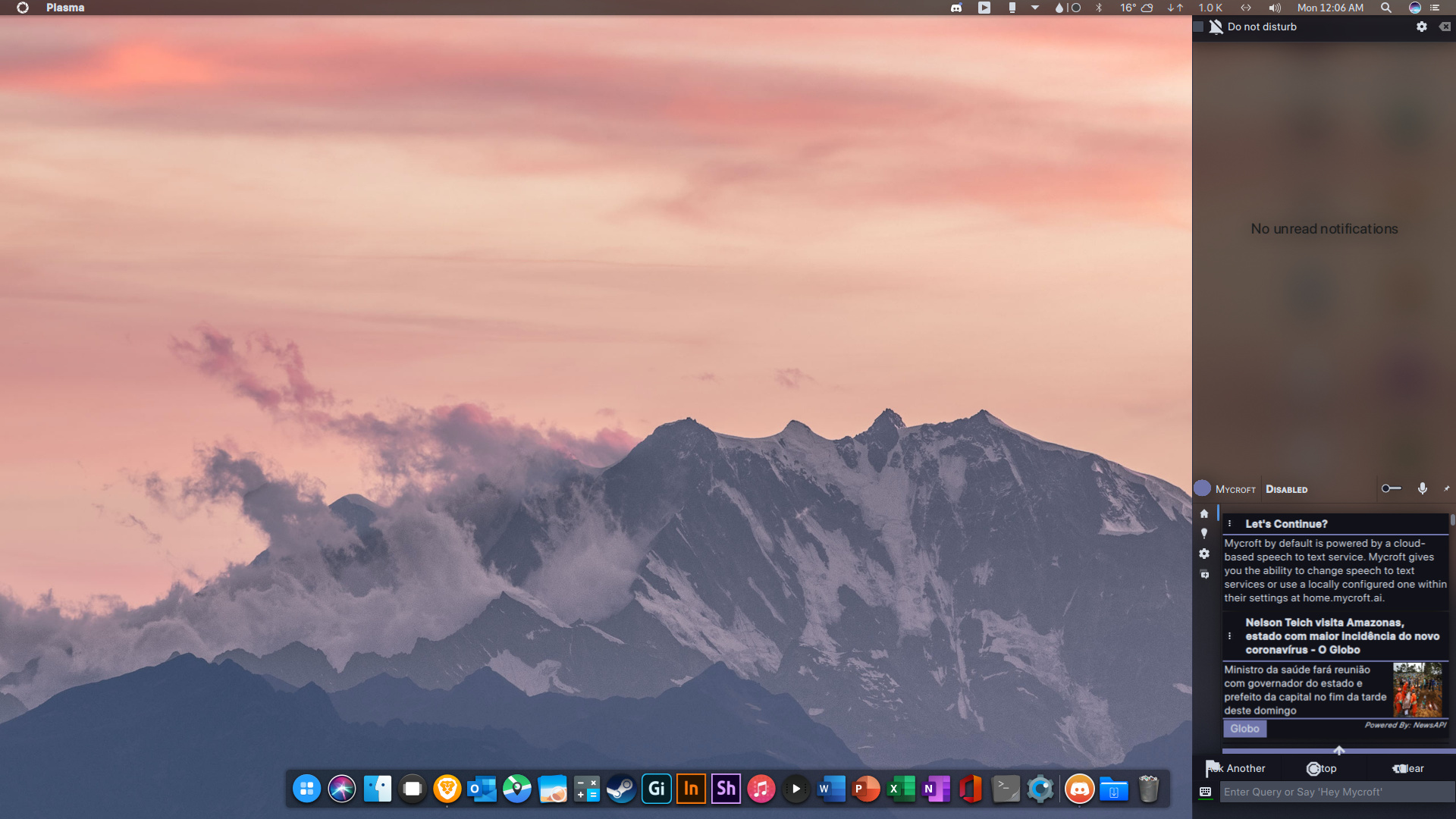 Modifiquei um pouco o layout. Adicionei uns plasmóides extras no painel superior e coloquei o plasmóide do Mycroft no painel lateral.