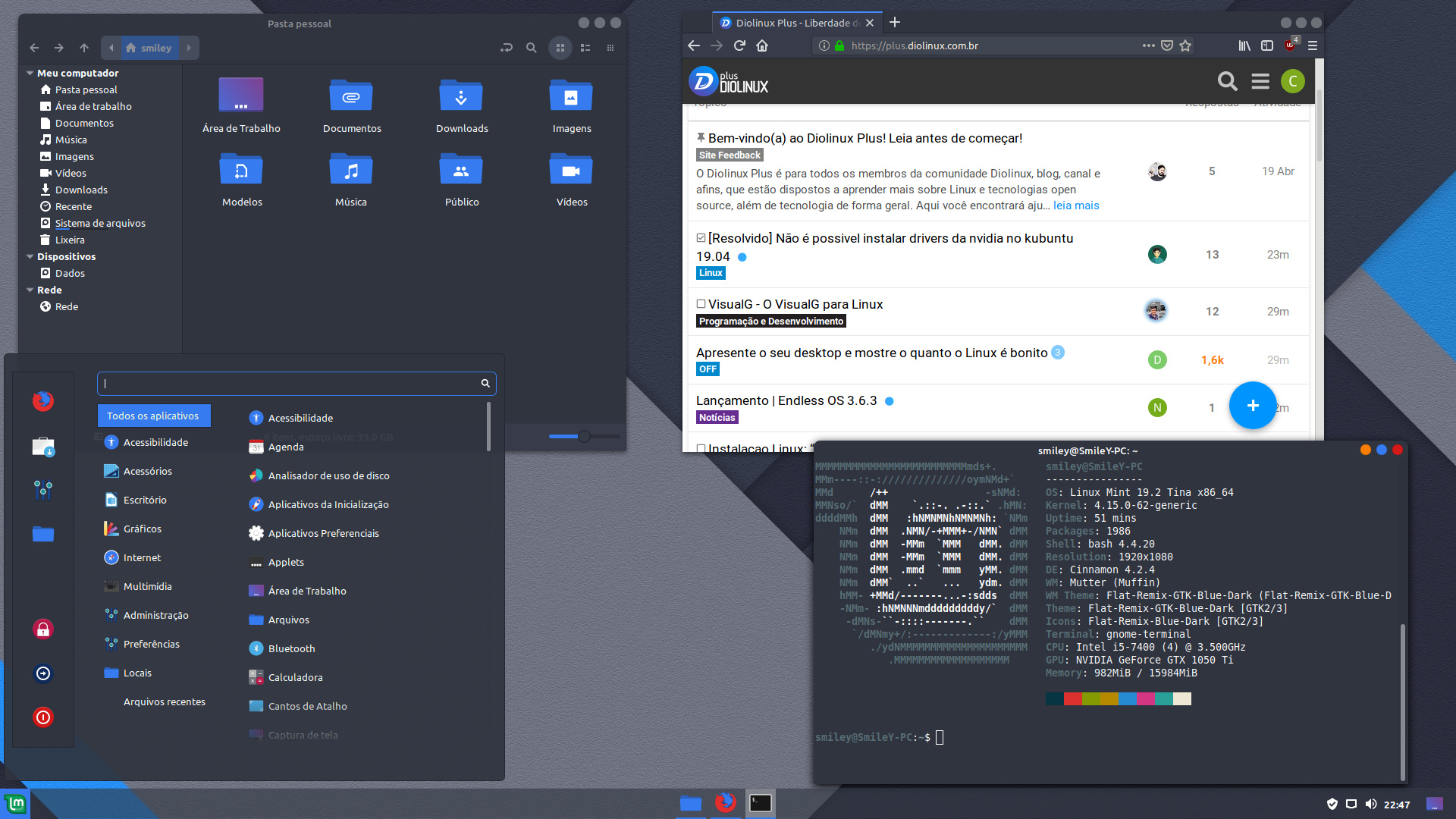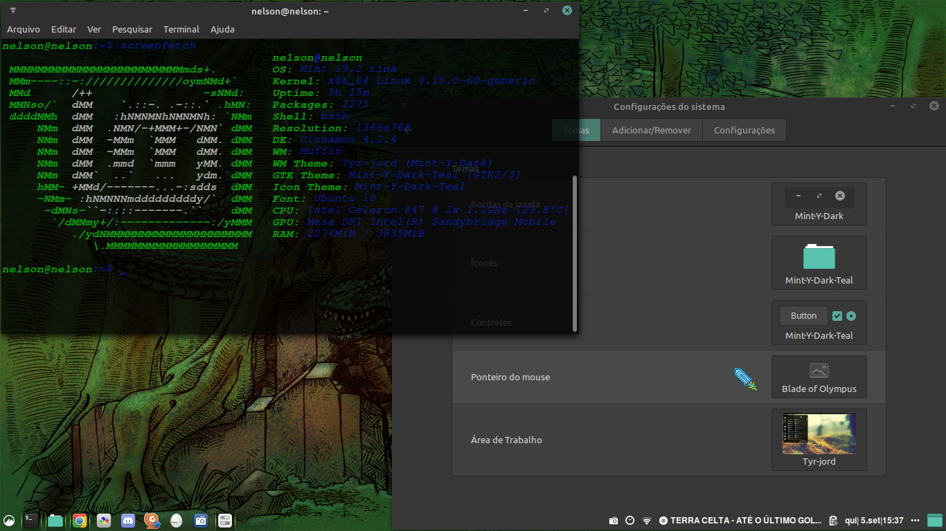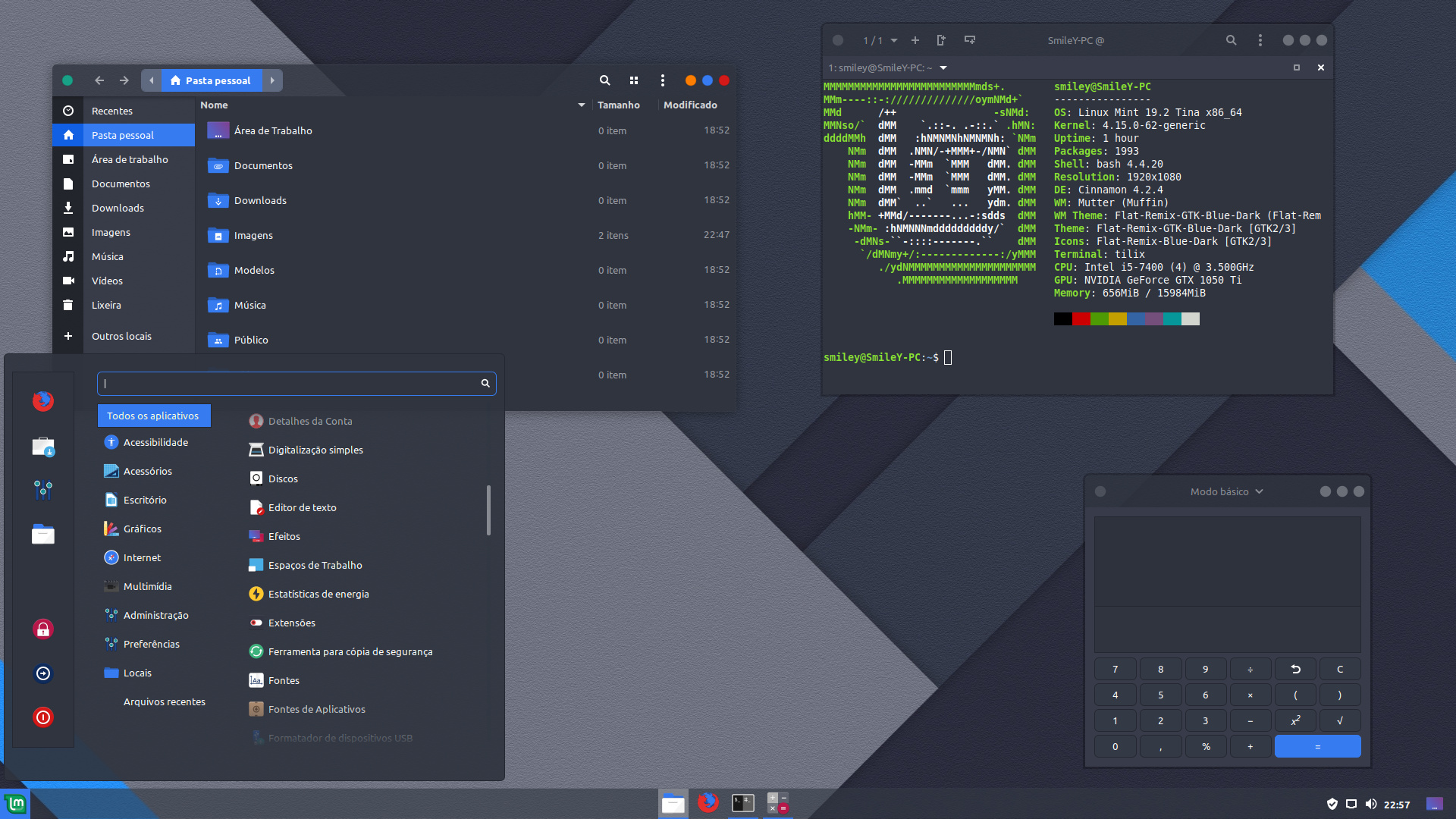 Cinnamon + Flat Remix Blue Dark, outra bagunçada no painel e o resultado.