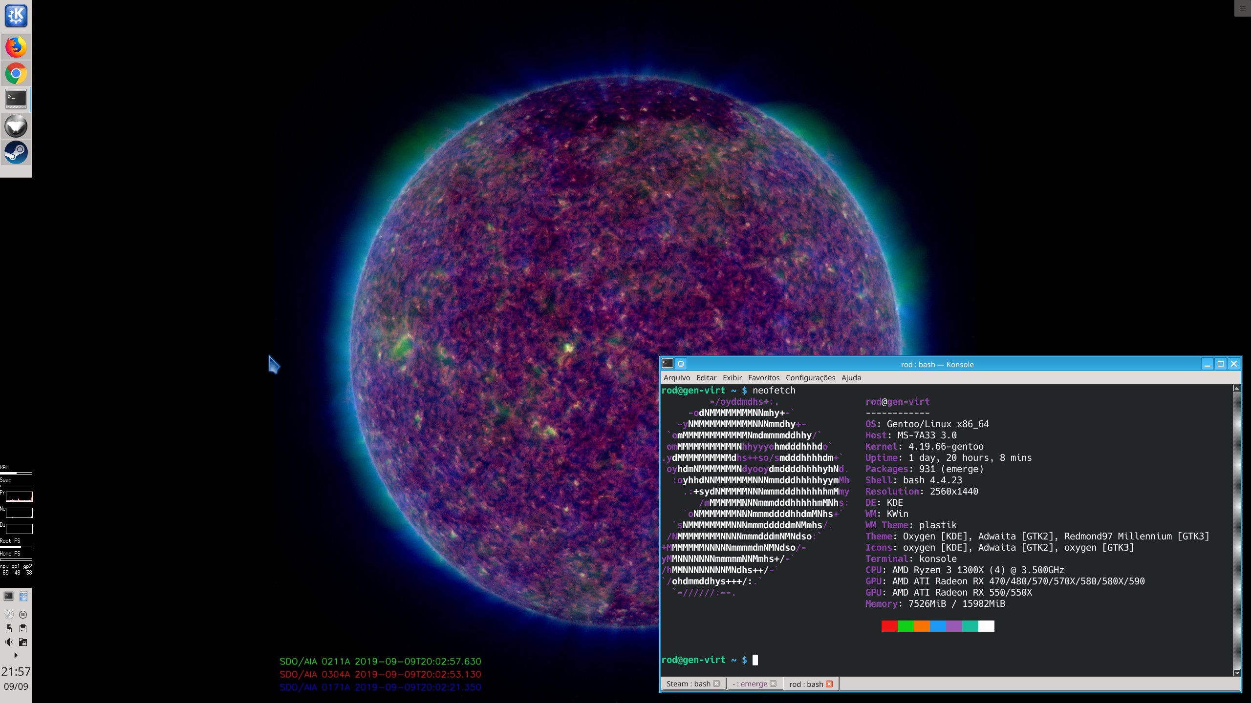 Uma vitória pessoal! Gentoo migrado da VM para bare-metal! Steam rodando. A imagem do sol atualizada a cada 3 horas (via script no cron). Visual antiguinho lembrando os primórdios das intefaces gráficas, me sinto bem a vontade.