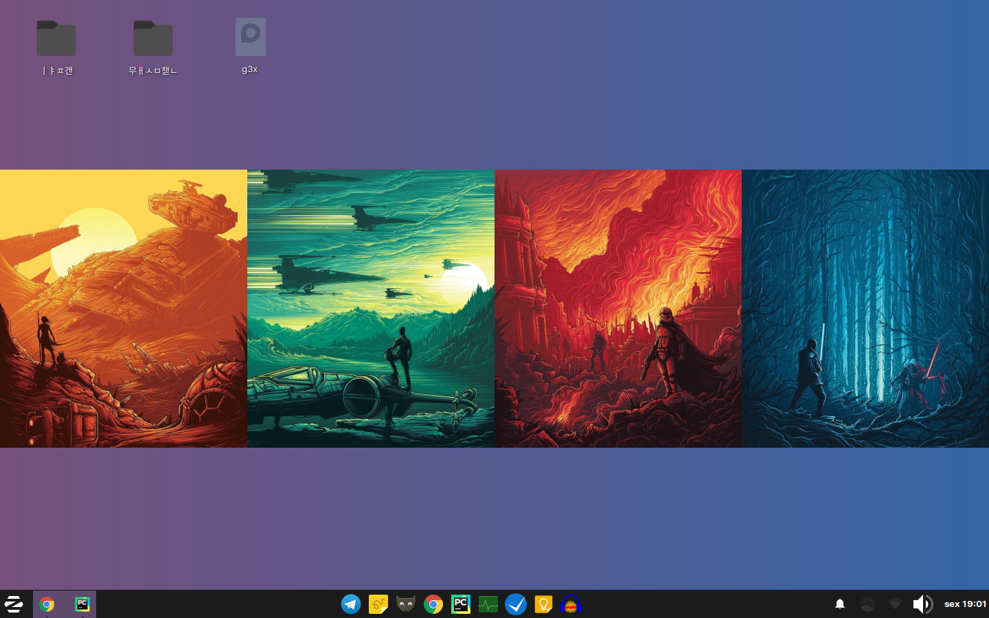 Olá pessoal! Montei esse desktop usando um gradiente horizontal, nativo do ambiente xfce no Zorin O.S 15 Lite, com as cores roxo e azul, junto de um wallpaper de Star Wars em 3840x1080. Centralizei os ícones usando separadores e esse foi o resultado. O que acharam?