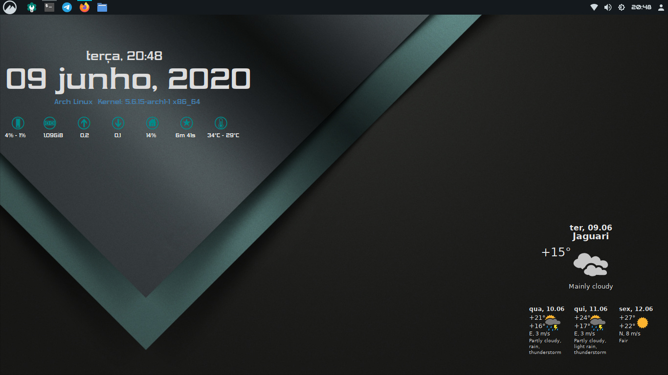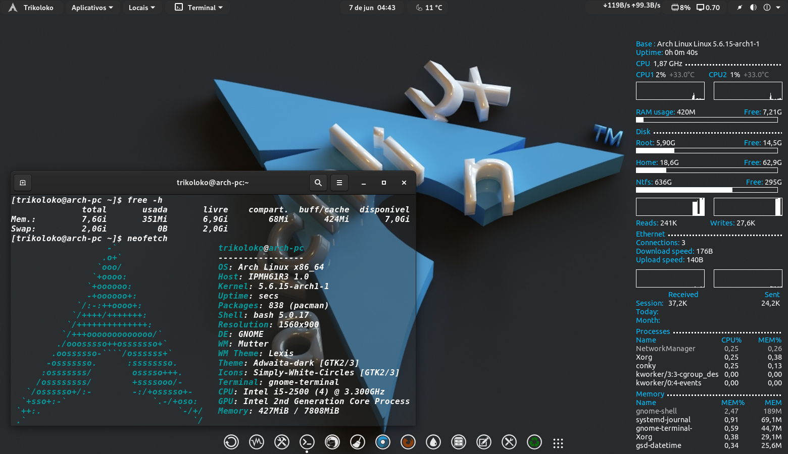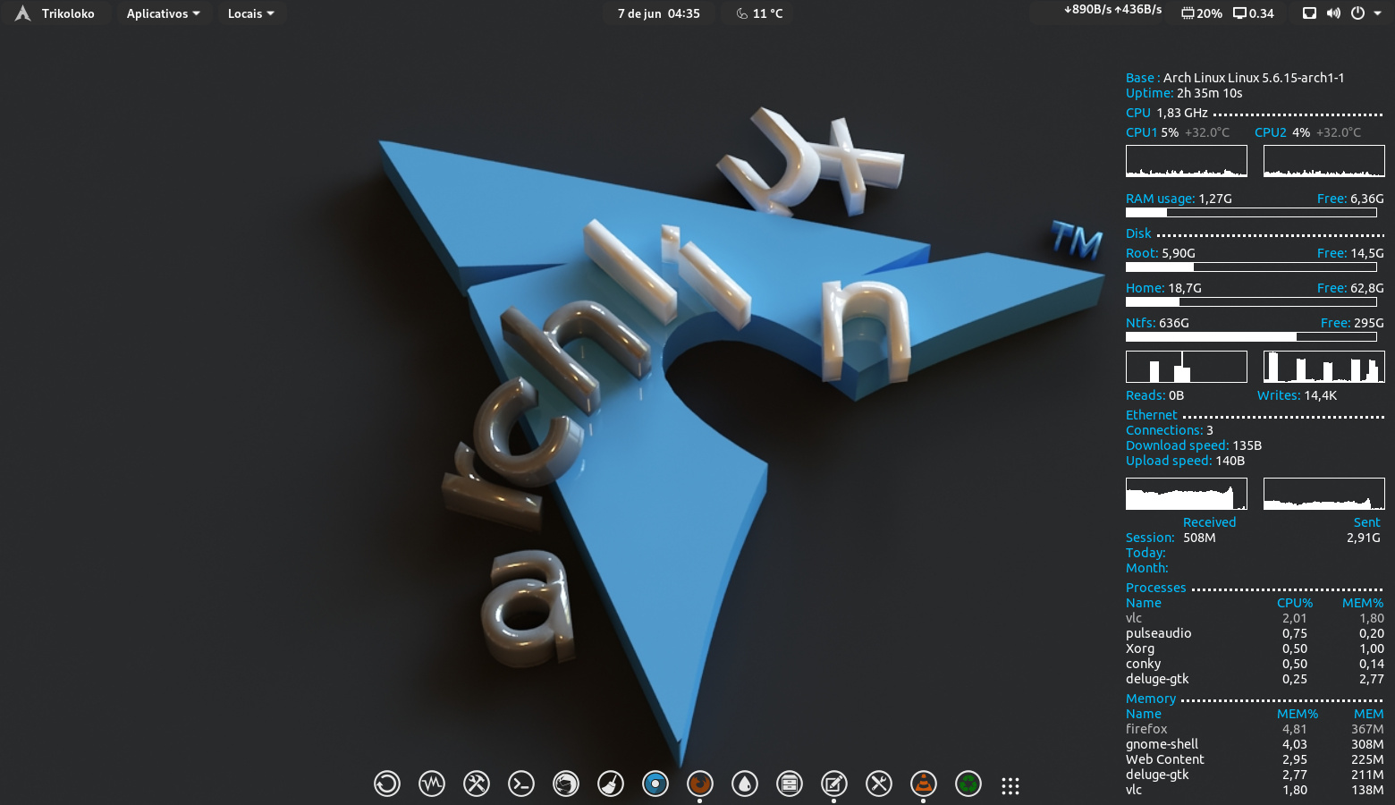 As únicas alterações que fiz, foi instalar o Dash To Dock, substituir o texto das atividades pelo logo da distro e aplicar uma transparência na barra superior.