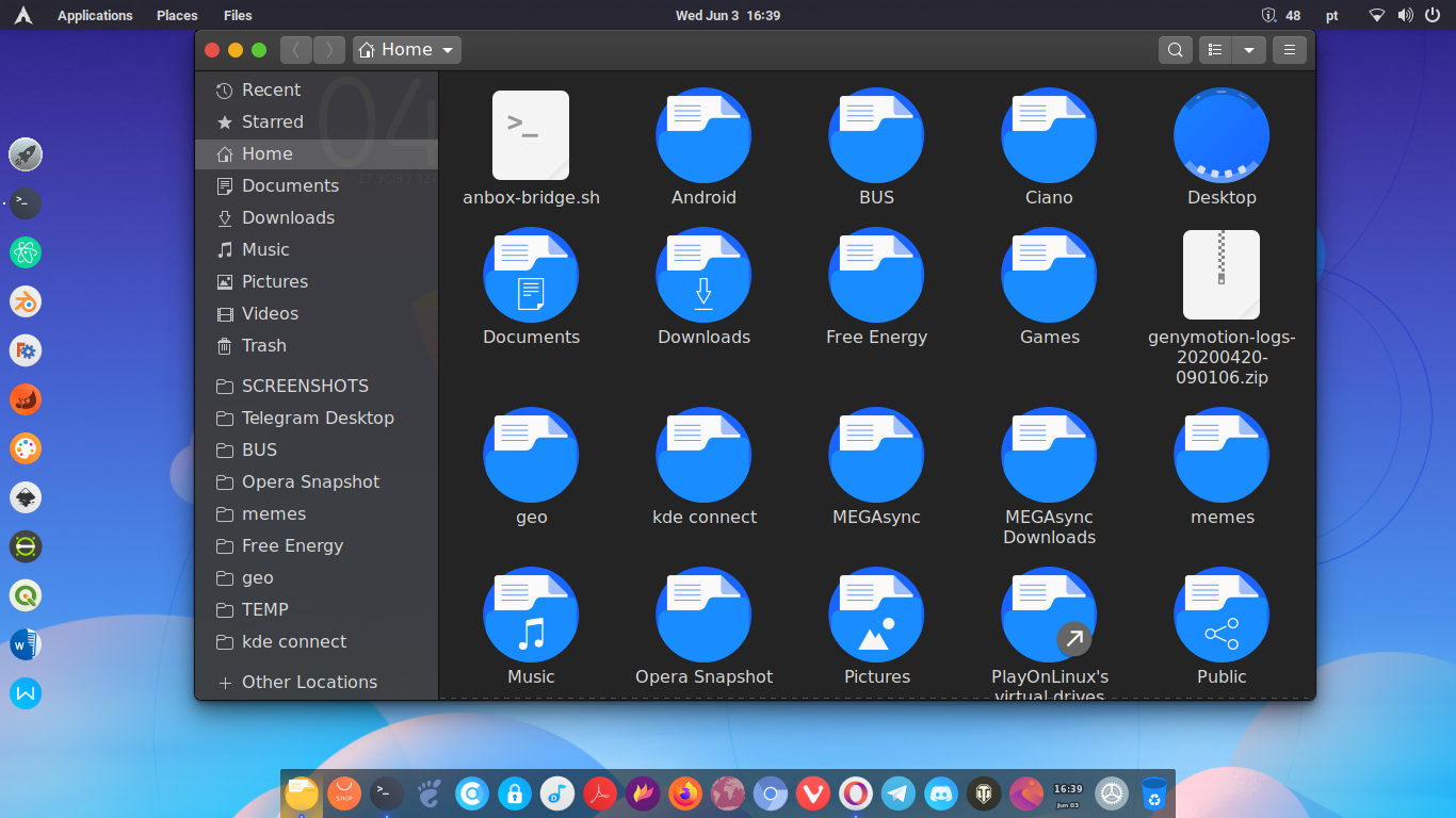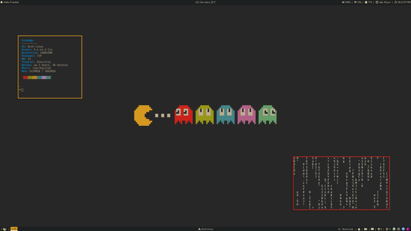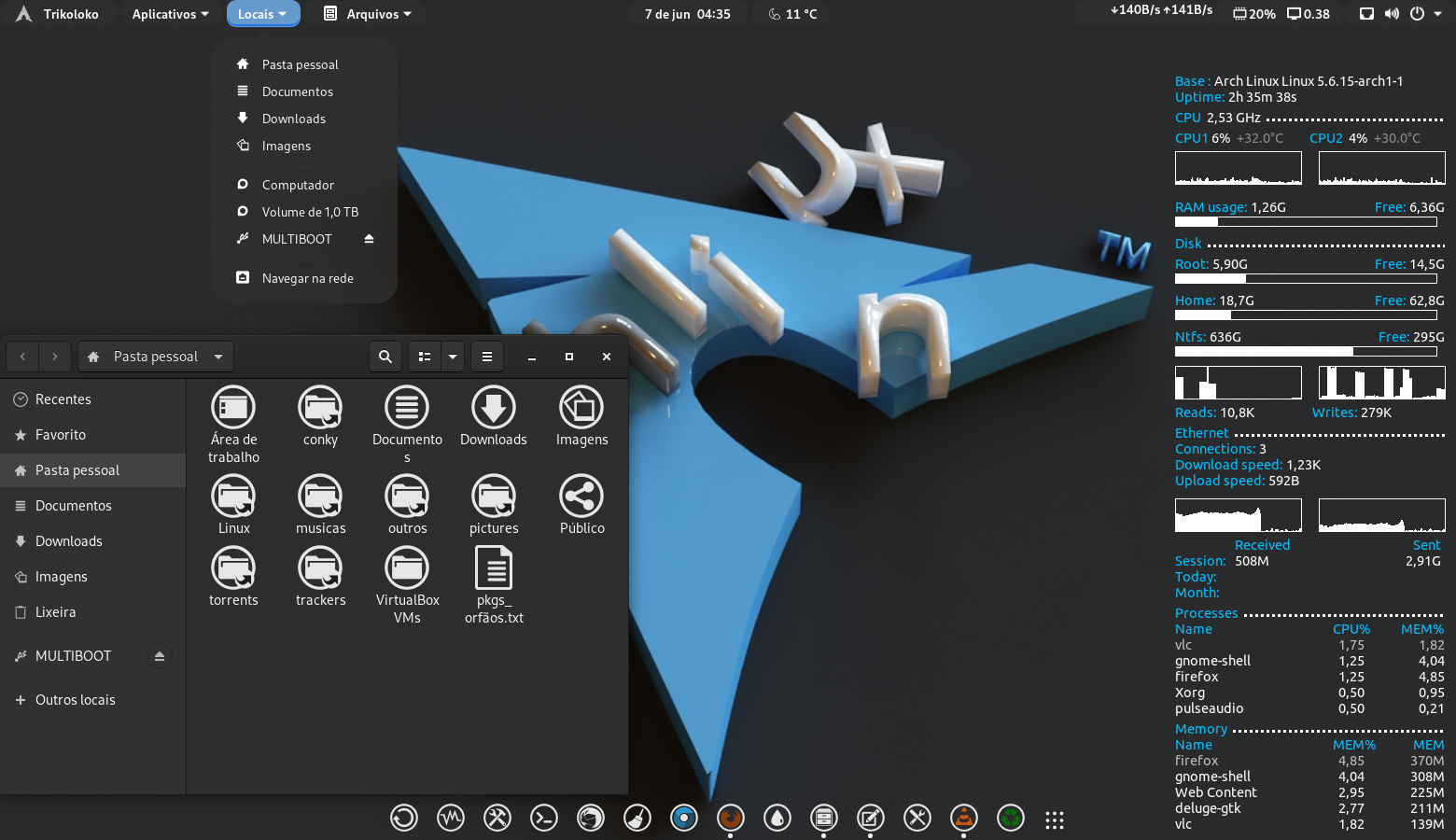 As únicas alterações que fiz, foi instalar o Dash To Dock, substituir o texto das atividades pelo logo da distro e aplicar uma transparência na barra superior.