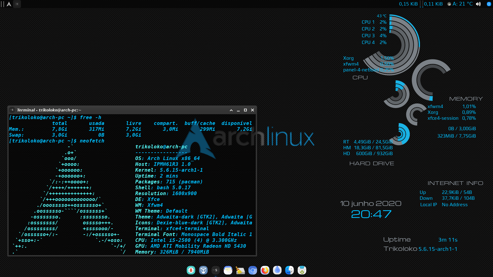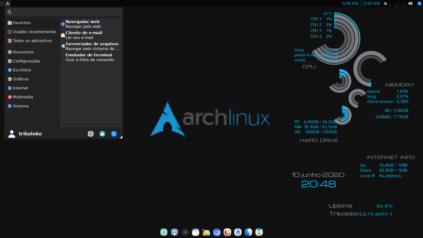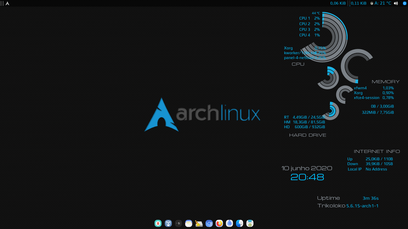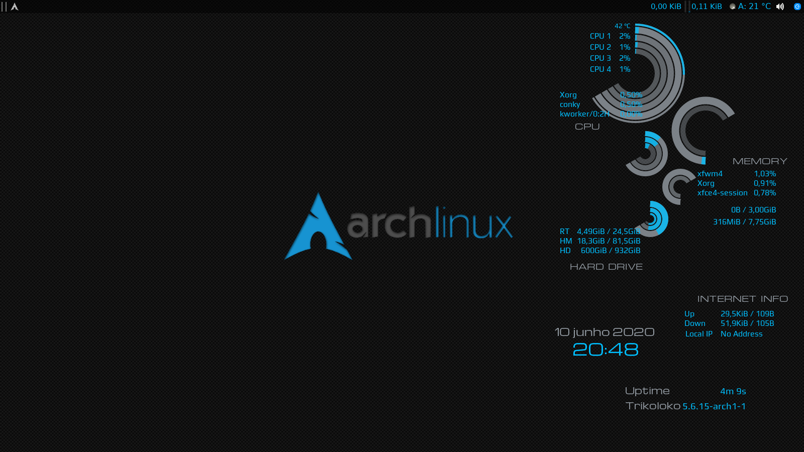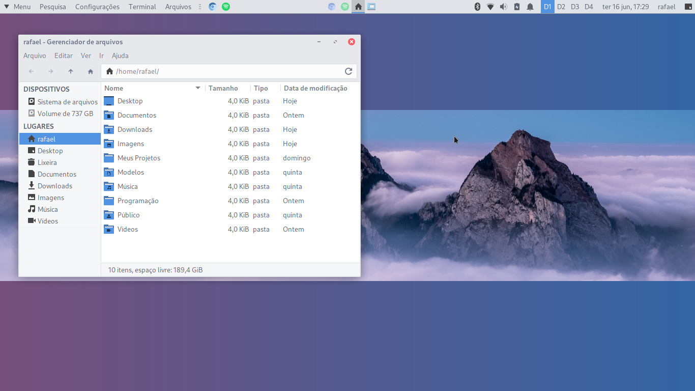 Queria mesmo era usar um WM Tiling, mas ainda não tenho a coragem de deixar só ele no sistema principal (na hora de fazer algo na pressa eu iria me enrolar kkk). Enquanto isso tô com o XFCE.