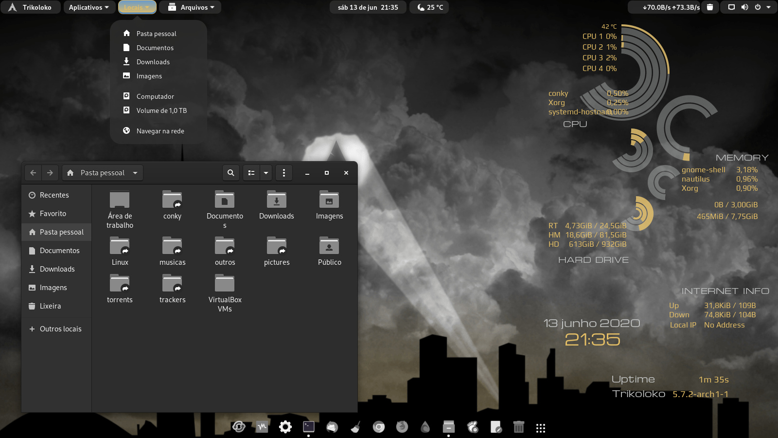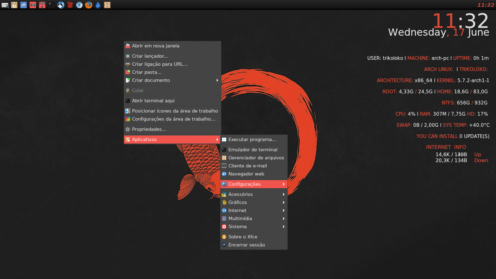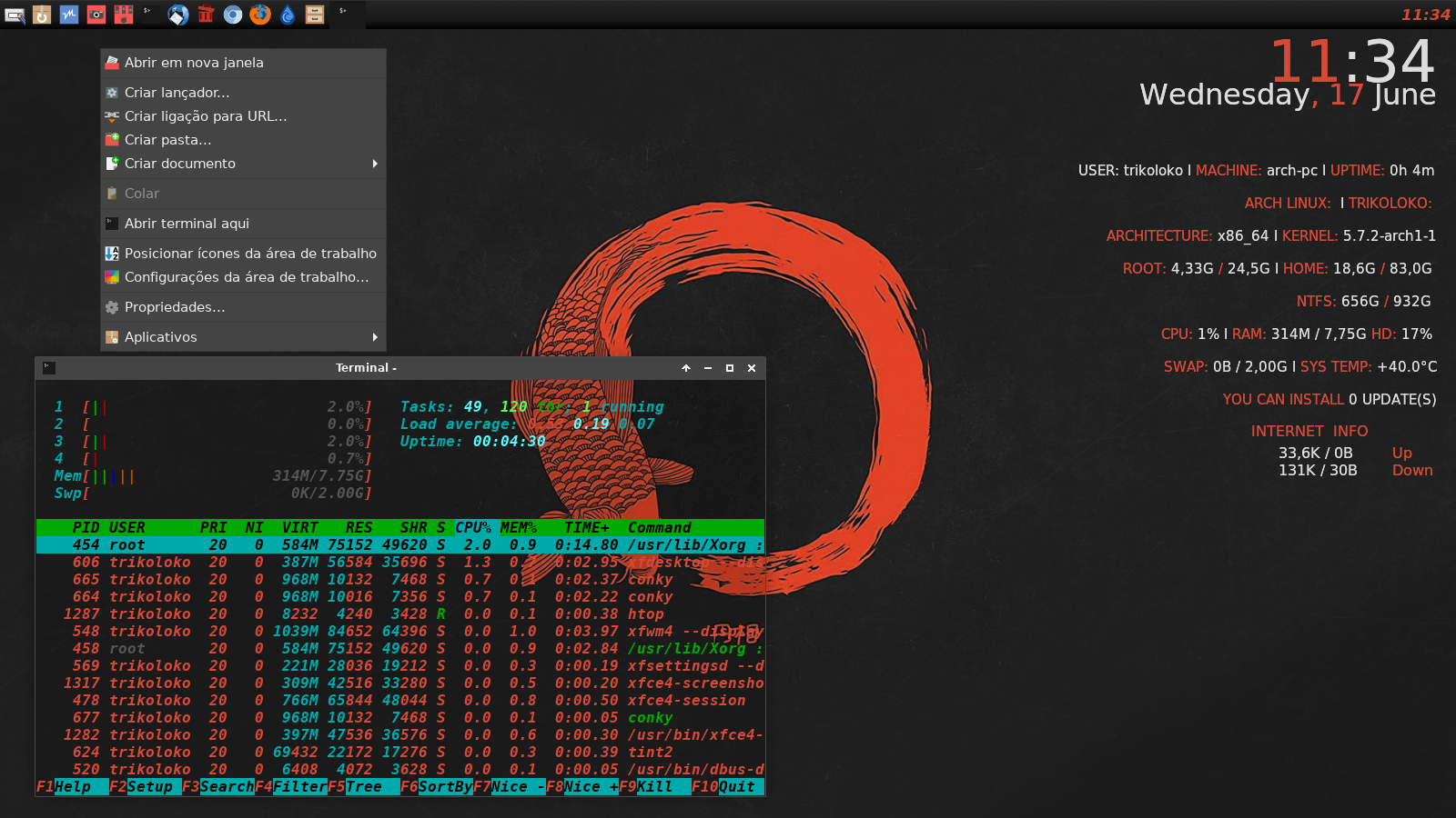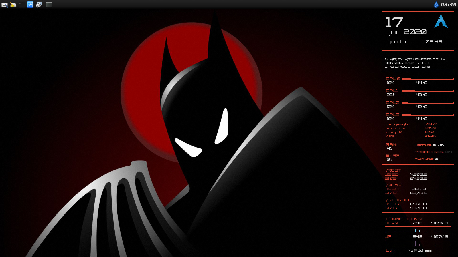 Queria mesmo era usar um WM Tiling, mas ainda não tenho a coragem de deixar só ele no sistema principal (na hora de fazer algo na pressa eu iria me enrolar kkk). Enquanto isso tô com o XFCE.