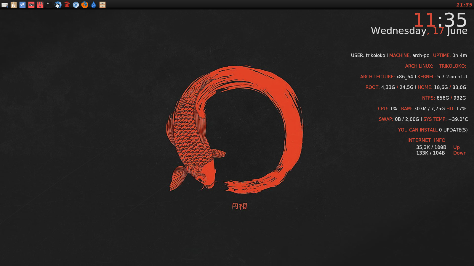 Void linux, rápido, leve, i3wm + i3status, cbatticon para monitorar a bateria , tray icon weather feito com o yad e tray icon poweroff também feito com yad =)
