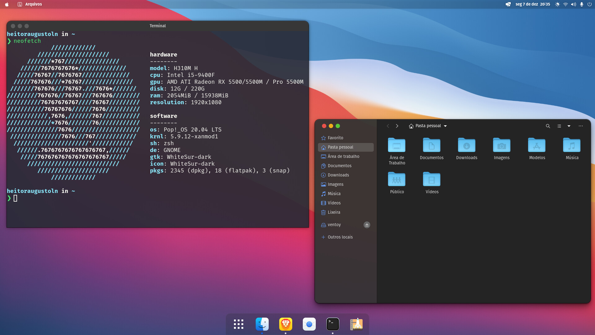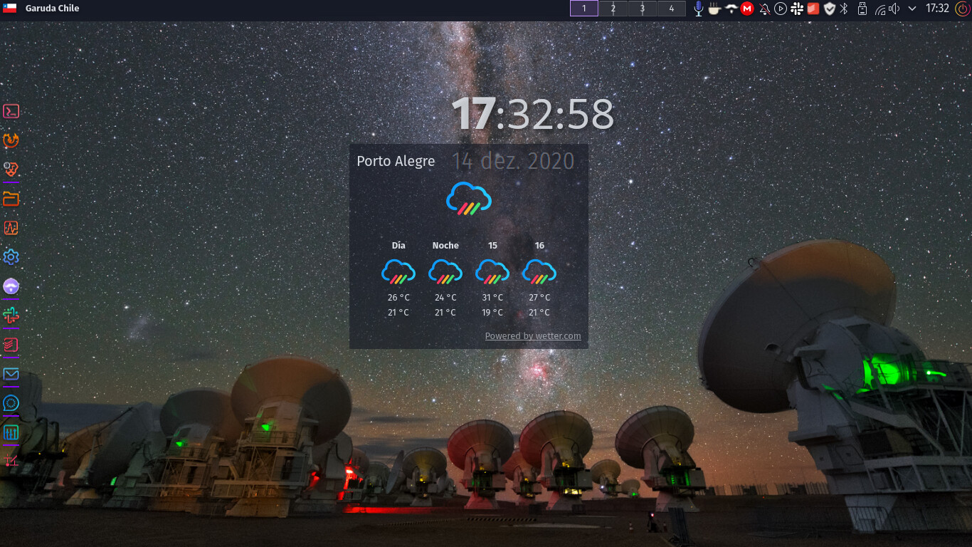 Usei painel flutuante no topo da tela para integrar com as janelas maximizadas. Plank Dock com o tema ChromeOs Dark Lite (Rounded) também modificada, uma coleção de wallpaper com Via Láctea e Aurora Boreal e como menu usei Rofi Launcher, onde faço busca rápidas. Batizei meu desktop como TOGETHER devido a integração dos elementos no ambiente.