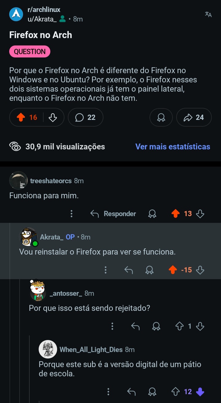 ai são três prints do reddit, mais especificamente do subreddit “archlinux”. Esse subreddit funciona como um fórum, e as pessoas podem dar “upvote” se gostarem do comentário ou “downvote” se não gostarem.