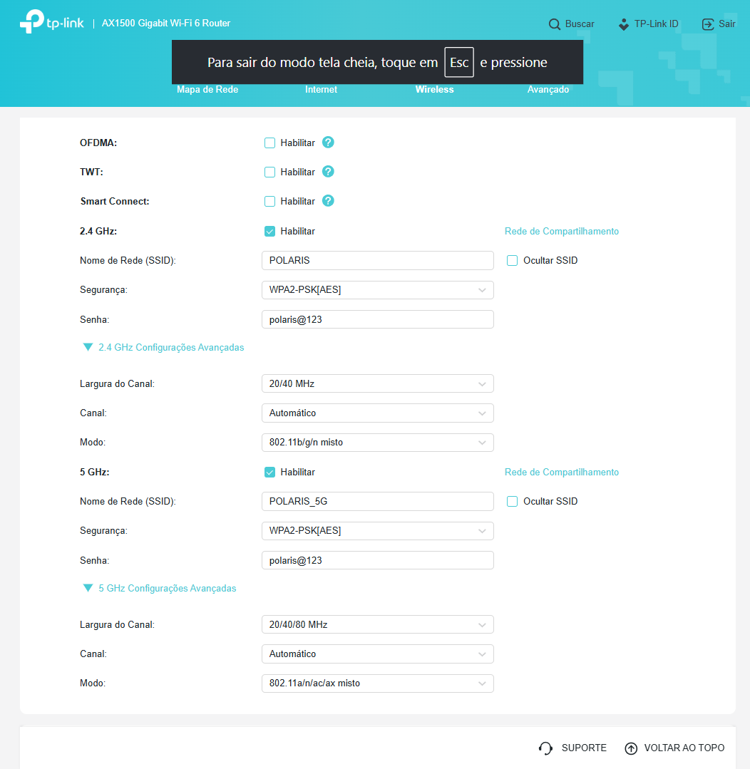 - Em 2,4 GHz: 802.11n. Você só vai precisar da compatibilidade dos outros modos para conectar aparelhos bem antigos… Err… Vale a pena verificar se todos os aparelhos que você usa são compatíveis com o 802.11n… às vezes você pode ter um notebook antigo, ou qualquer outro dispositivo eletrônico com conexão wi-fi antigas…