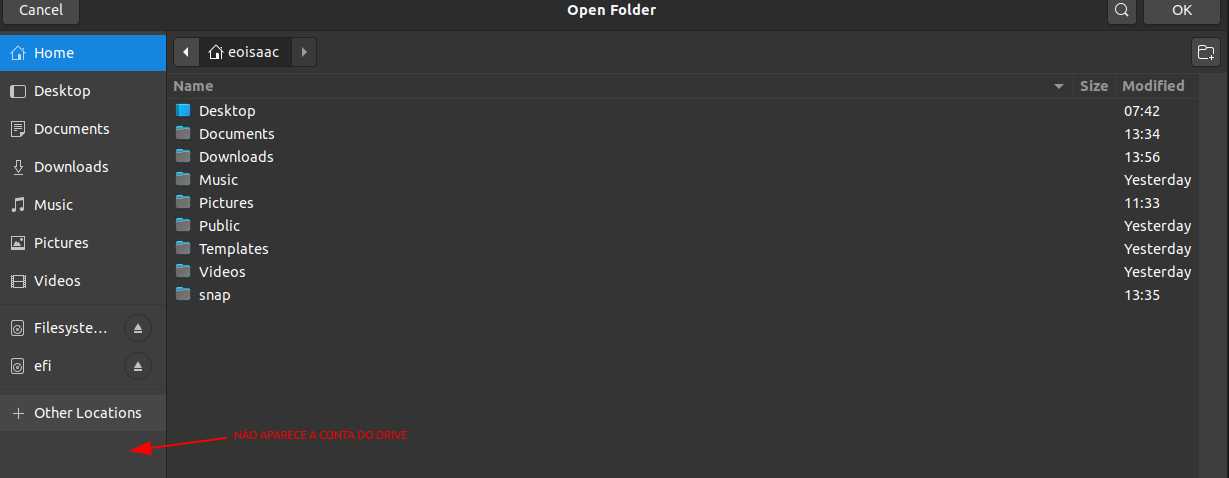 No Linux não achei essa ferramenta de sincronização, mas descobri que tem como sincronizar apenas conectando minha conta do google nas “Contas Online” do OS. Acontece que no VSCode, por exemplo, eu não consigo acessar diretamente a pasta do drive(foto 1), a pasta do drive nem aparece. Quando eu tento abrir a pasta usando outra aplicação e tento usar o vs code a pasta até abre, porém os arquivos ficam com nomes muito esquisitos(foto 2).