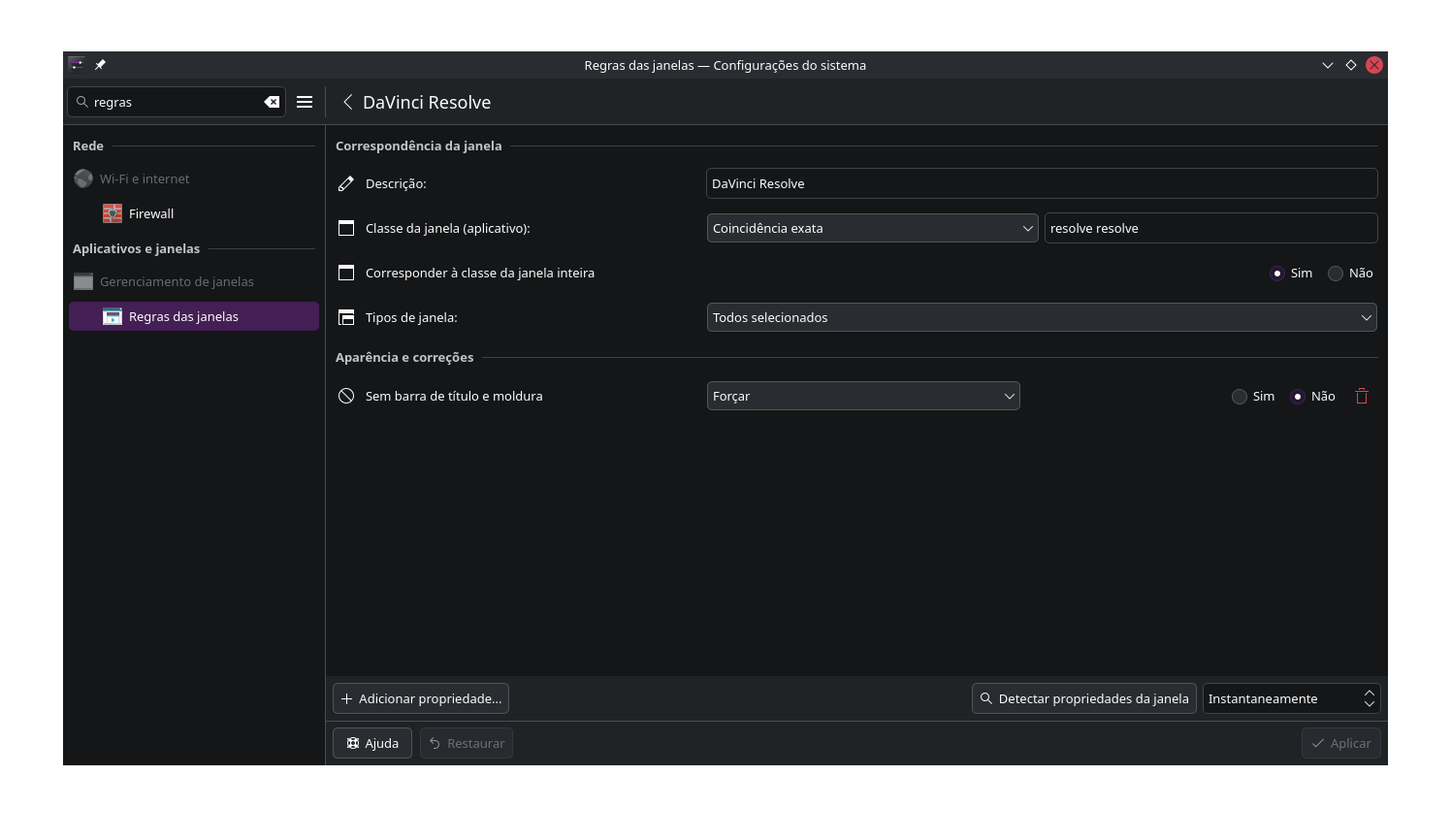Como usuário do DaVinci Resolve no Linux, duas coisas que sempre me incomodaram são a falta dos botões de janelas e a aparência meio sem foco das opções de menu. Porém, consegui corrigir a falta dos botões no KDE Plasma por meio do recurso: Regras de Janelas. Conforme mostram as imagens abaixo, vocês podem conferir como ficou e vou deixar também a configuração que eu utilizei para criar a regra de janela específica para o DaVinci. Sei que isso pode ser irrelevante para a usabilidade desse software, mas pode ser que incomode algumas pessoas como eu.