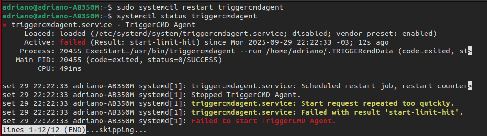 O Agent do TriggerCMD precisa estar sempre rodando em segundo plano para quando eu der o comando, o gemini sugeriu para eu verificar o status do serviço pelo comando “systemctl status triggercmdagent” e o resultado foi (Inativo).