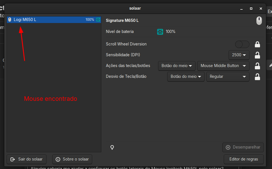 Alguém saberia me ajudar a configurar os botês laterais do Mouse logitech M650L pelo solaar?