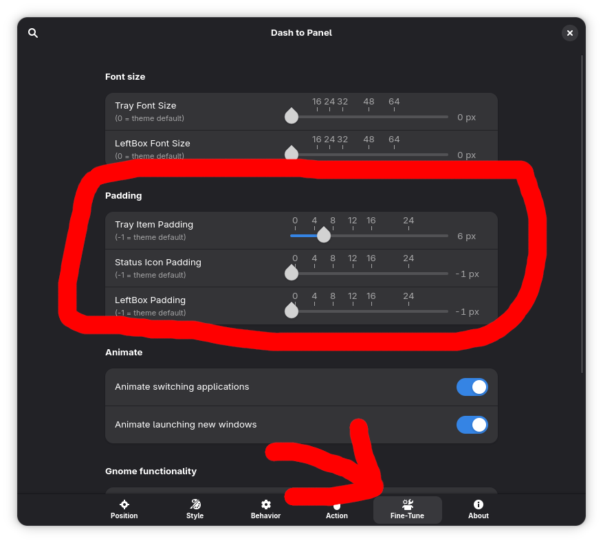 Tentei usando o Dash to Panel e o que queria a princípio não consegui fazer, que era esconder os ícones da bandeja (no caso aqui na foto é o clipboard indicator, zapzap, steam, etc) e nem acabar com esse comportamento dos ícones cortados, e fazendo esse slide ao passar o mouse por cima.
