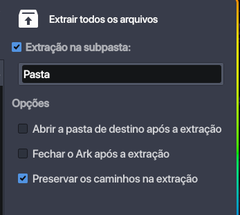 No Windows, o WinRAR possui um menu contextual que permite extrair todos os arquivos selecionados para uma única pasta. O Ark, geralmente extrai cada arquivo compactado para a sua própria pasta.