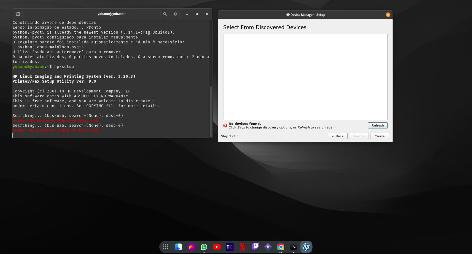 Estou tentando instalar um driver de scanner para poder digitalizar alguns documentos, o xsane não consegue achar a impressora.