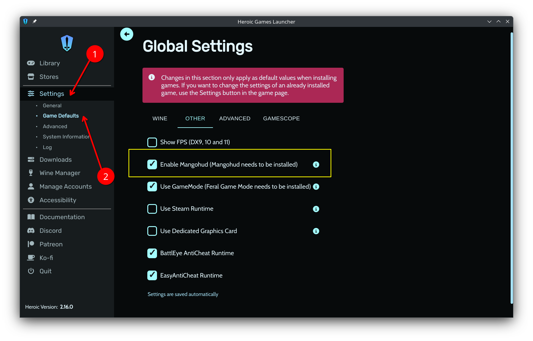 No Heroic Launcher, você pode ativar o MangoHud para todos os jogos entrando em “Settings/Game Defaults” e marcando a opção “Enable Mangohud”.