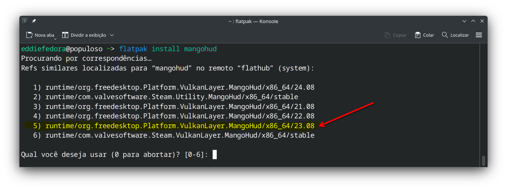Agora selecione a opção com a versão correta do runtime, neste exemplo, seria a opção 5 e pressione enter.