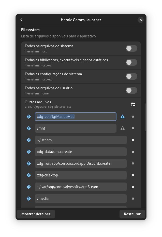 - Em alguns ambientes é indicado adicionar uma permissão extra para o Heroic usando o Flatseal, em meus testes essa variável não ajudou na solução do problema.