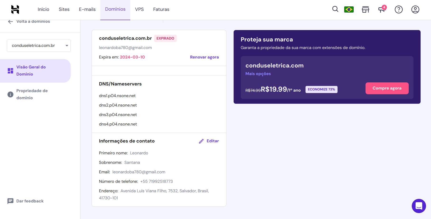 Possuo um domínio que estava configurado no site da Hostinger. Eu propositalmente não renovei com o objetivo de administrá-lo pelo site registro.br.