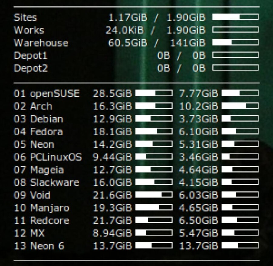É mais para “conhecer” distros “muito diferentes”, umas das outras: – Tenho 1 distro “Buntu” (KDE Neon, em 2 instalações diferentes); – 2 distros “Debian” (Debian e MX Linux); – 2 distros “base-Arch” (Arch e Manjaro); – 2 distros “base-Mandrake” (PCLinuxOS e Mageia); – e 1 de “ramos” próprios, bem diferentes entre si: openSUSE, Fedora, Slackware, Void, Redcore (Gentoo).