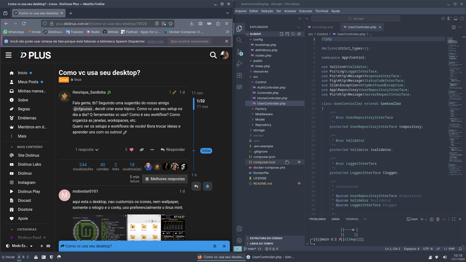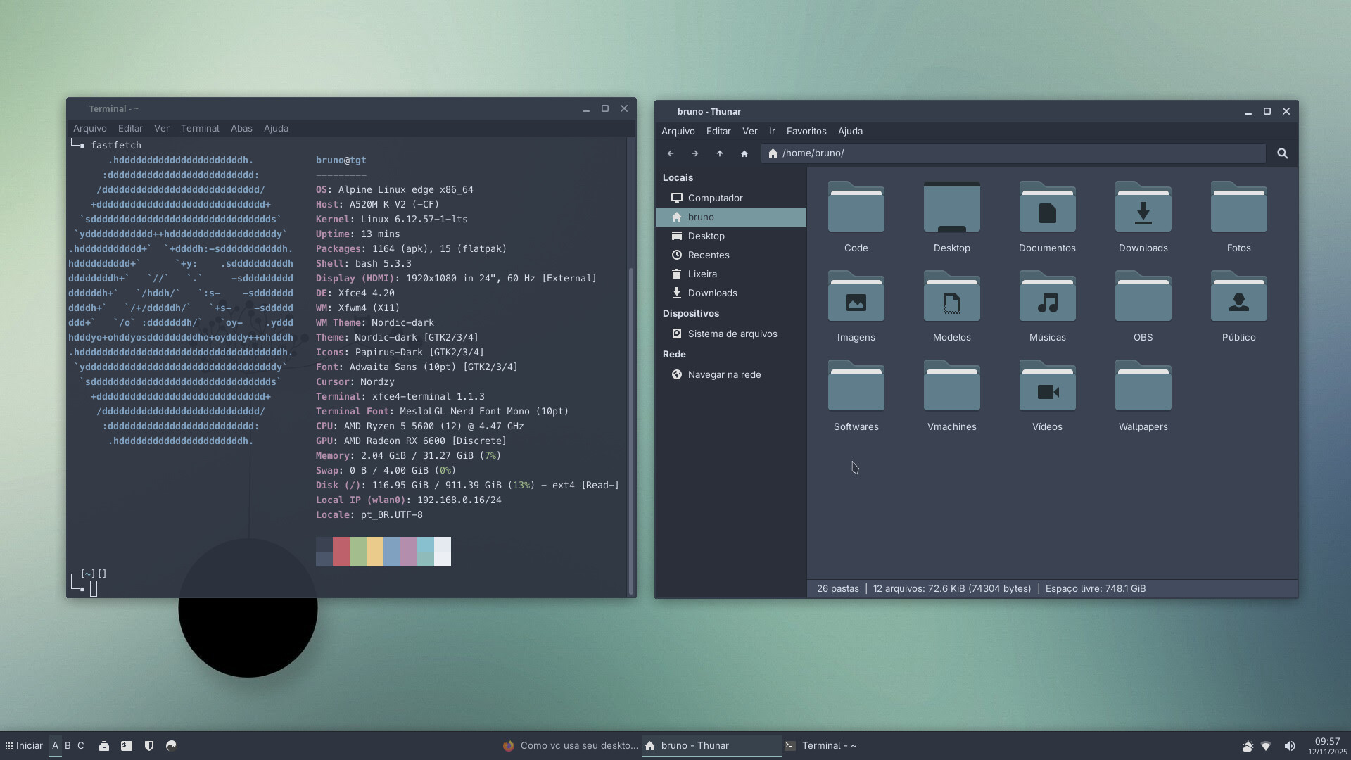 Gosto do XFCE, bem levinho e prático. Sobre o desenvolvimento crio sempre uma Docker com as dependências necessárias tipo: PHP, banco de dados, composer… Não as instalo no desktop. Inspirado pela praticidade do Sway, ajustei as configurações do XFCE de forma a proporcionar um bom dinamismo para dividir as janelas e navegar entre áreas de trabalho usando apenas o teclado. Áreas de trabalho geralmente uso 2, no máximo 3 e não passa disso.