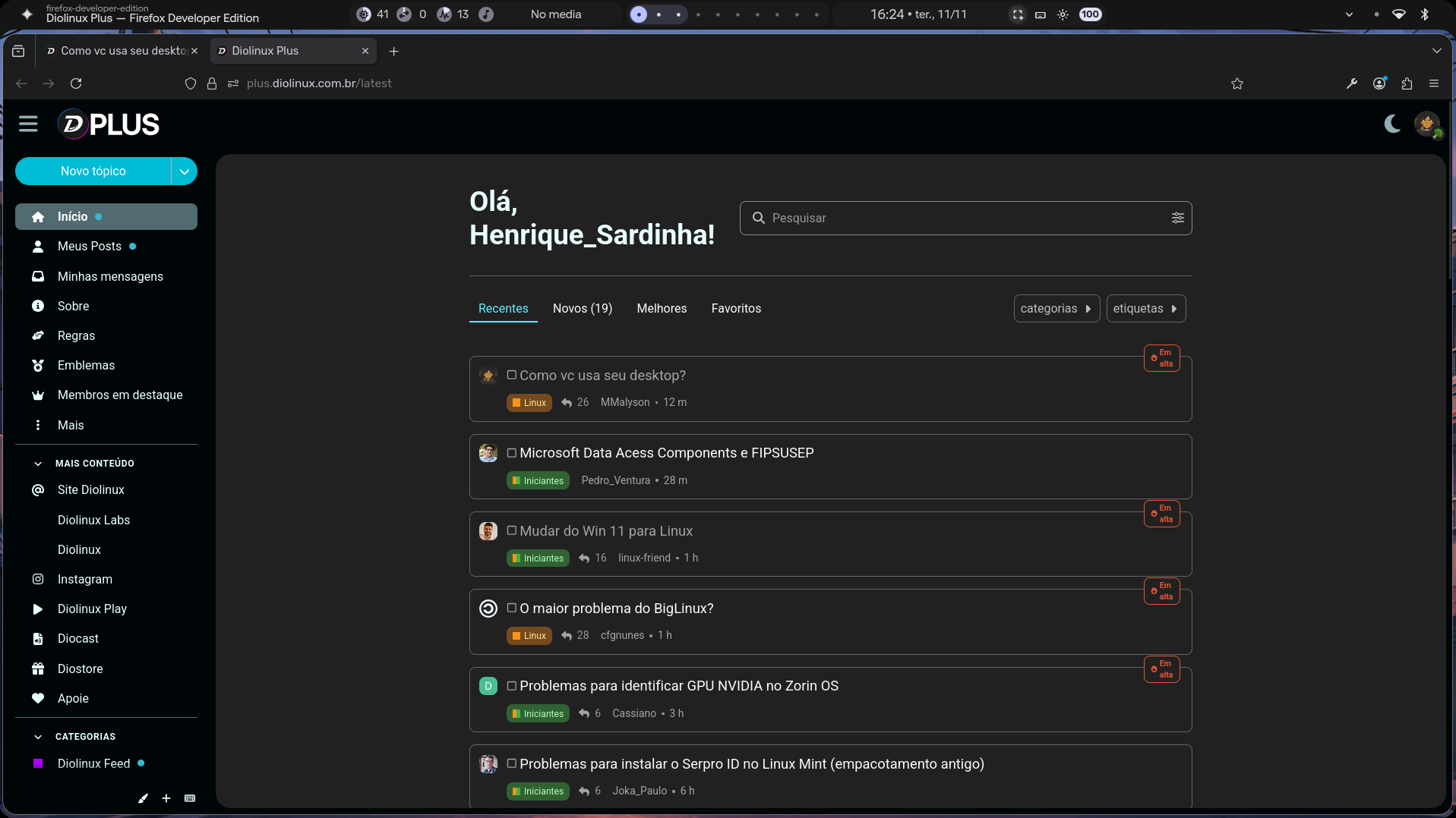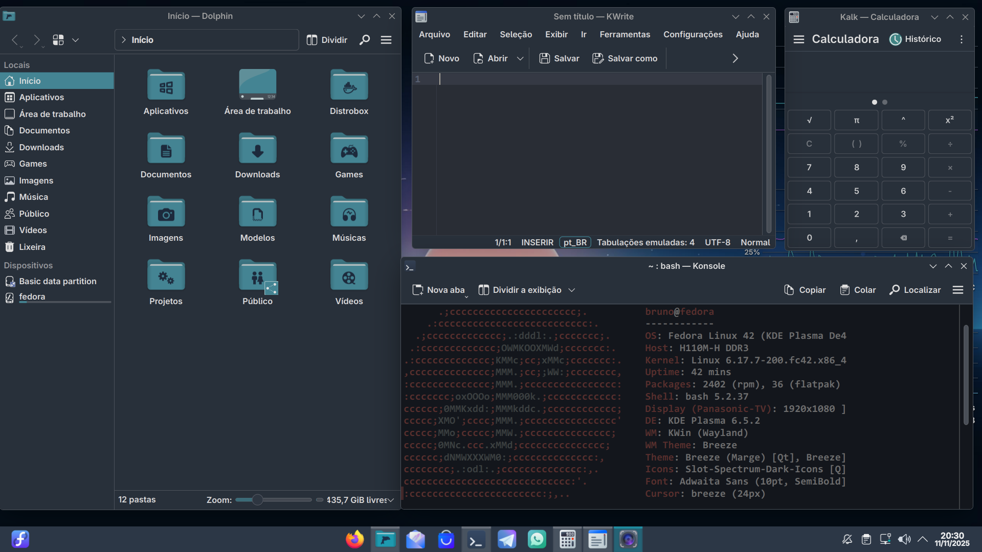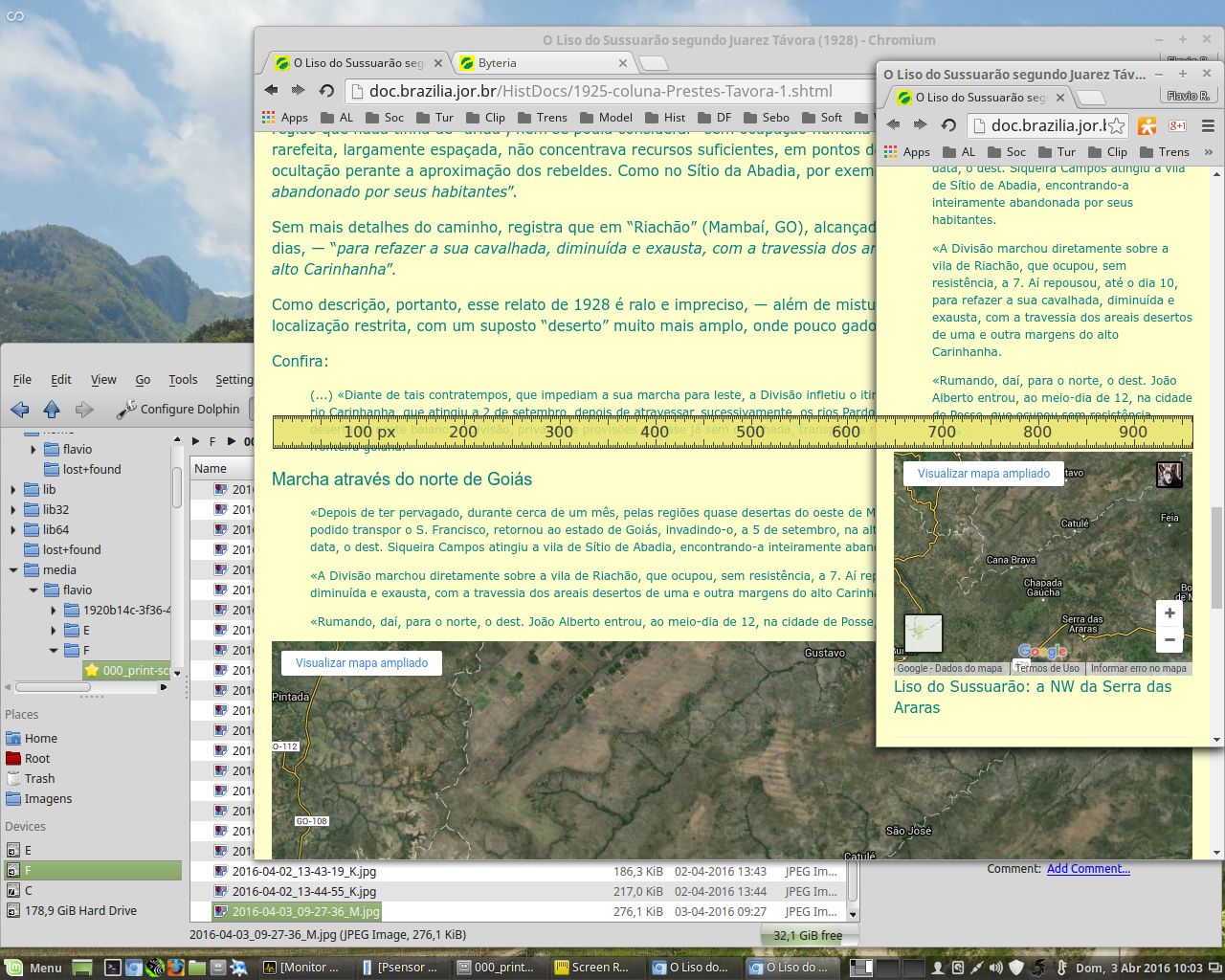 Atualmente, faço poucas coisas: – Mapas no Google Earth desktop (app); poucas edições no Gimp (simplifiquei o Toolbox, só com as ferramentas que uso muito) e muitas “anotações” em imagens no Gwenview; ler ePub no Foliate (evito PDFs, sempre que posso); algumas planilhas no LibreOffice; Kate e KWrite para textos, registros, anotações; um app de WhatsApp só para família e fornecedores (nada de grupos!); KDE Connect para baixar fotos; Google Chrome para navegar, pesquisar etc.; Dolphin para organizar os arquivos; Konsole para um monte de comandos cli e alguns scripts; y otras cositas más.