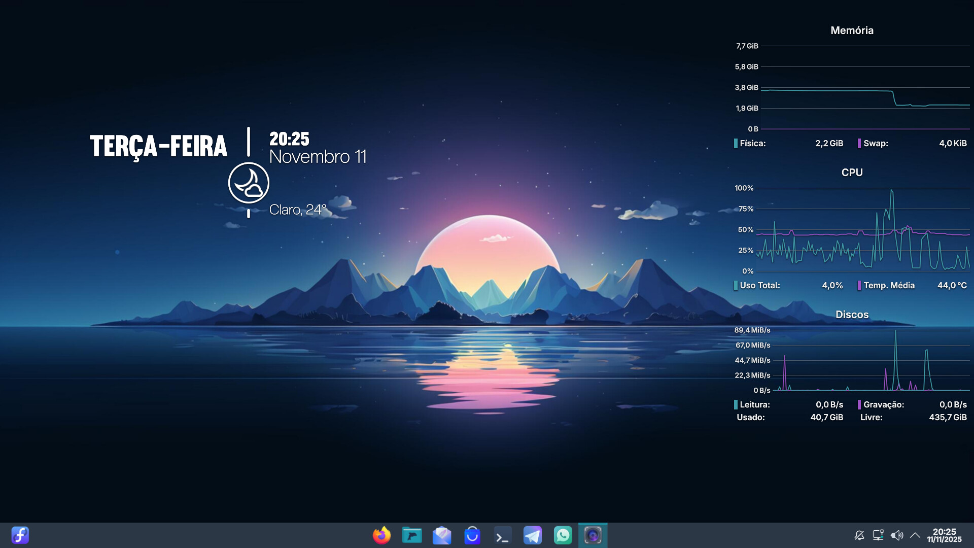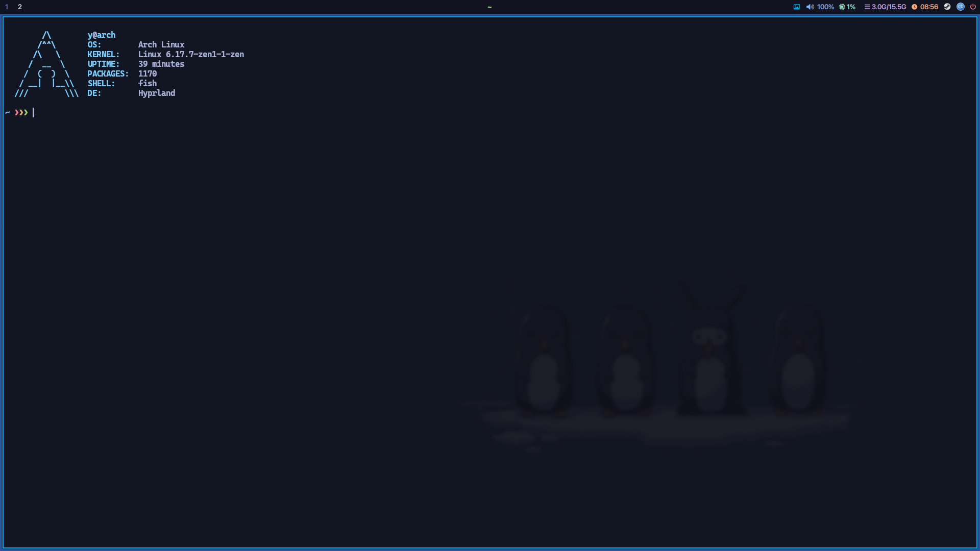 Uso o Hyprland, tentei usar o Niri recentemente mas acho que não é a minha. Uso o Dolphin e o Ranger como gerenciadores de arquivos, Ly como display manager, o navegador padrão é o Zen e não uso muito mais coisas que isso não. Hahaha