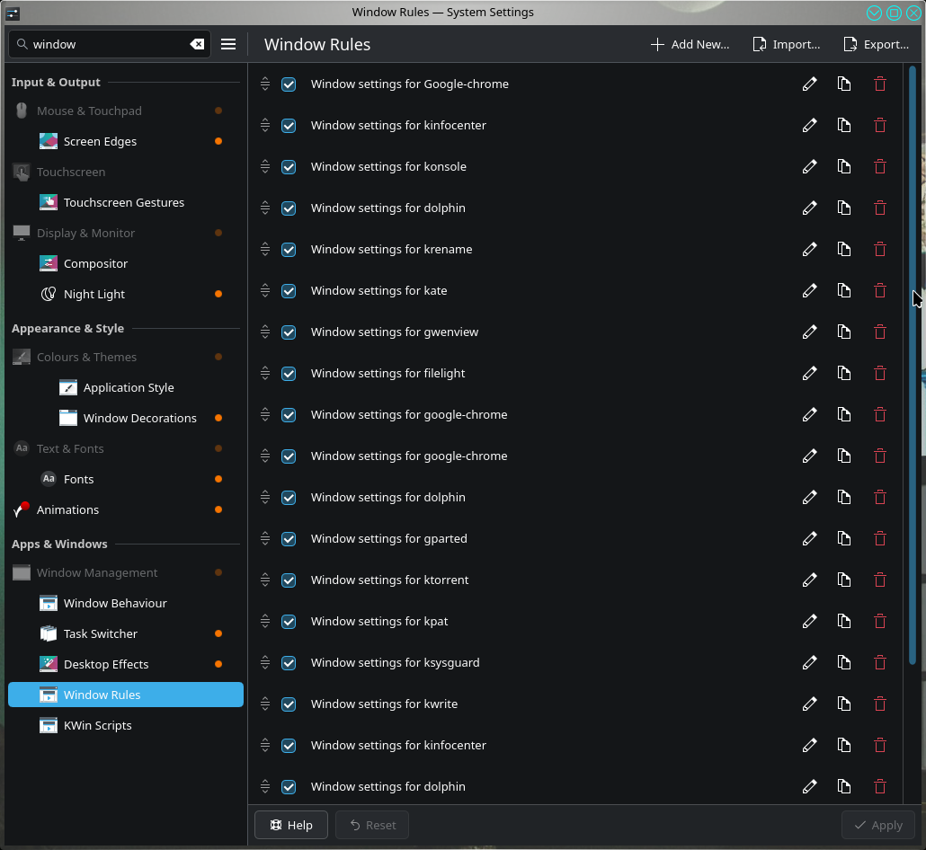 Tive uma curta experiência com tilling windows, e não gostei. – Ainda uso KWin para que cada aplicativo “lembre” a posição, formato e tamanho das respectivas janelas. – Cada app abre sempre nas mesmas posições e formatos que escolhi. (Um hábito que mantenho desde o WinXP, que deletei em 2016):