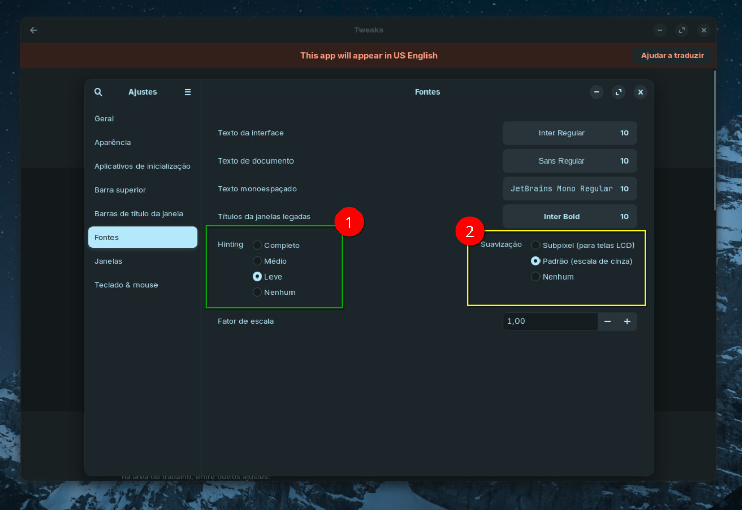 Se você estiver usando a interface padrão do Zorin, você vai precisar instalar o programa “GNOME Tweaks” ou “Ajustes do GNOME” para ter acesso a este ajuste fino na exibição das fontes.