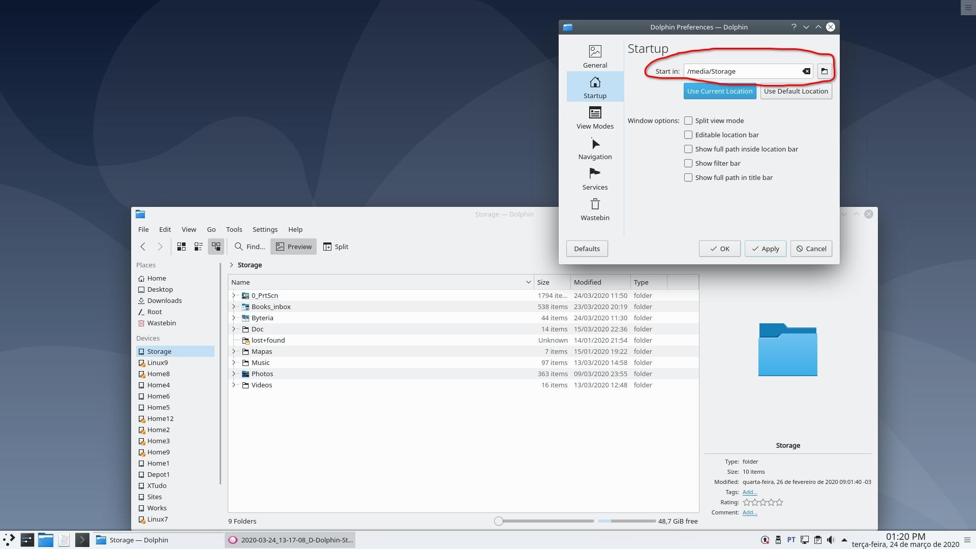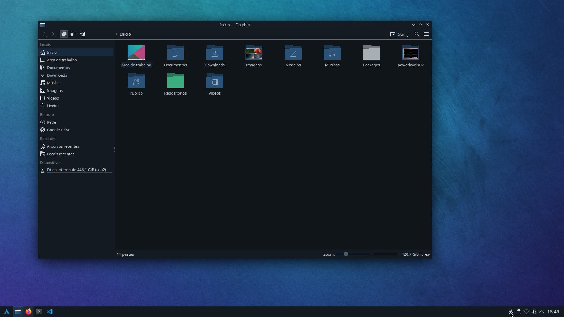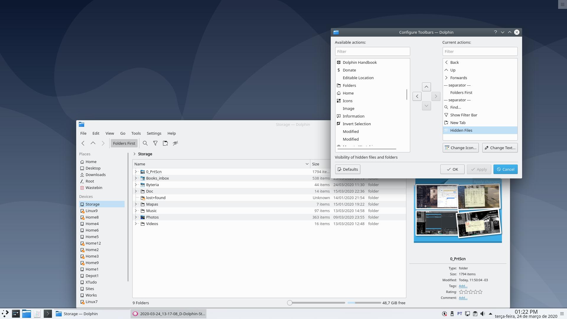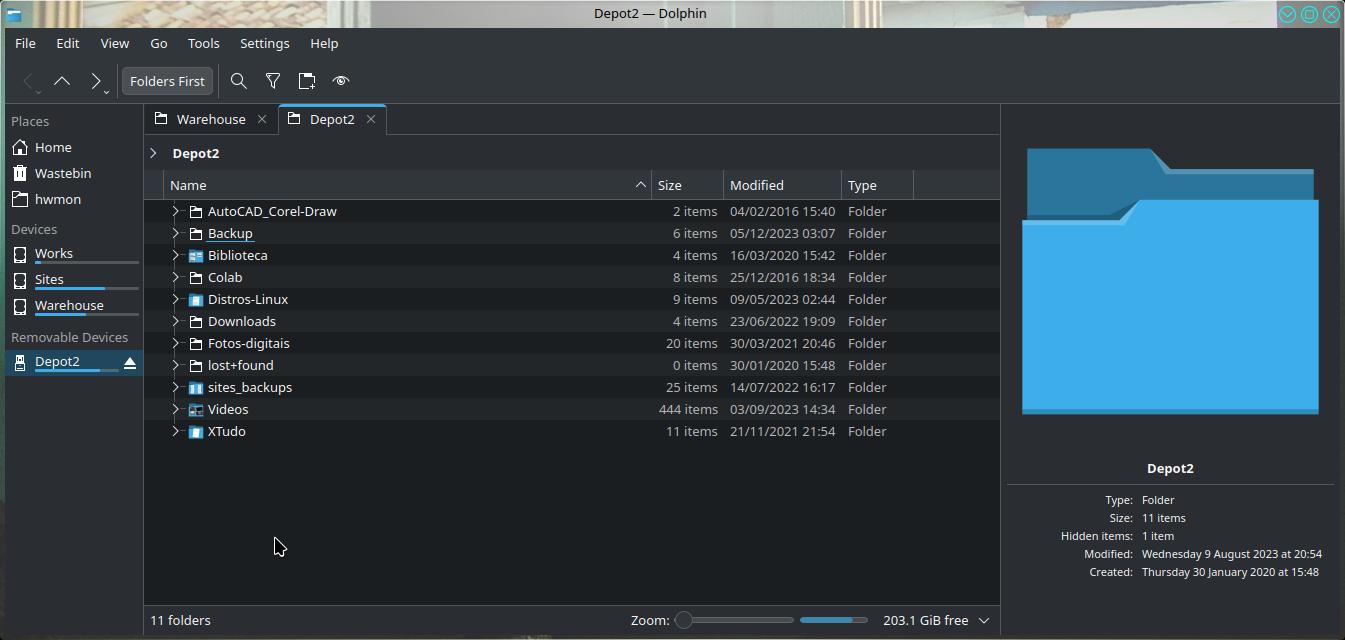 O backup integrado do Plasma é muito bom, fácil e integrado. Rapidamente selecionamos a pasta pessoal (exceto pastas de jogos) para backup em disco externo. O primeiro é demorado, mas depois ficou muito bom: é espetar o disco e já aparece o popup para fazer o backup incremental.