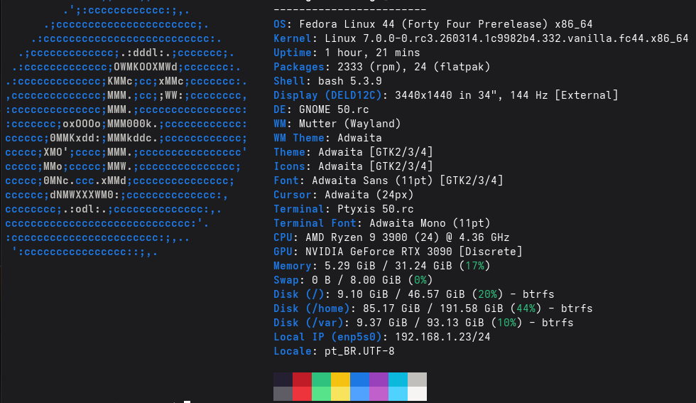 Estou testando a Workstation combando com o Kernel 7.0. Até o momento estou satisfeito com os resultados, sem bugs e desempenho satisfatório. O que mais eu gostei e acredito que é uma das melhores adições, é o GNOME 50. Está bem fluido, e não me fez falta do KDE Plasma durante a experiência de jogo.