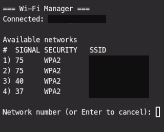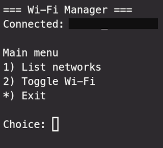 Criei um simples script para facilitar o uso nmcli (NetworkManager) no gerenciamento das conexões Wi-Fi. Ideal para ambientes sem interface gráfica, tiling window managers, e setups minimalistas.