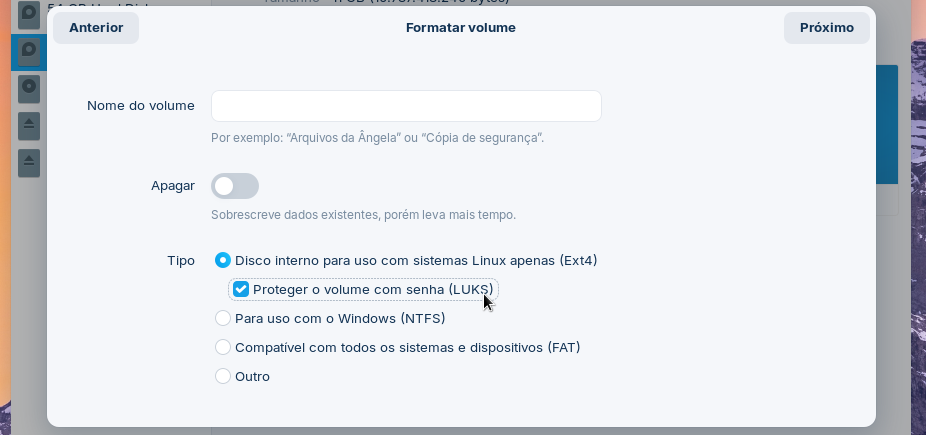 - Em seguida, será necessário criar uma partição, clicando no botão (+), com o disco selecionado. Selecione o sistema de arquivos Ext4 e marque a opção “Proteger o volume com senha (LUKS)”.