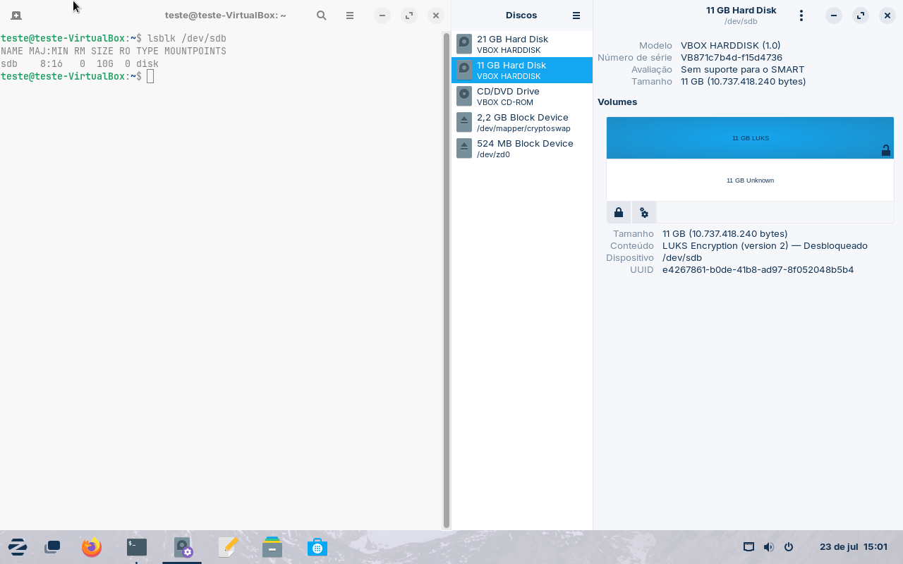 Assumindo que o disco de 11GB (/dev/sdb) seja onde você queira colocar a /home, e que a instalação do sistema operacional tenha sido feita no outro disco, com criptografia (não importa se selecionou LVM ou ZFS), vamos nos concentrar agora nesse disco de 11GB: criar o volume criptografado e o sistema de arquivos, que é só o que falta agora.