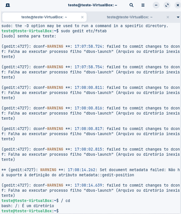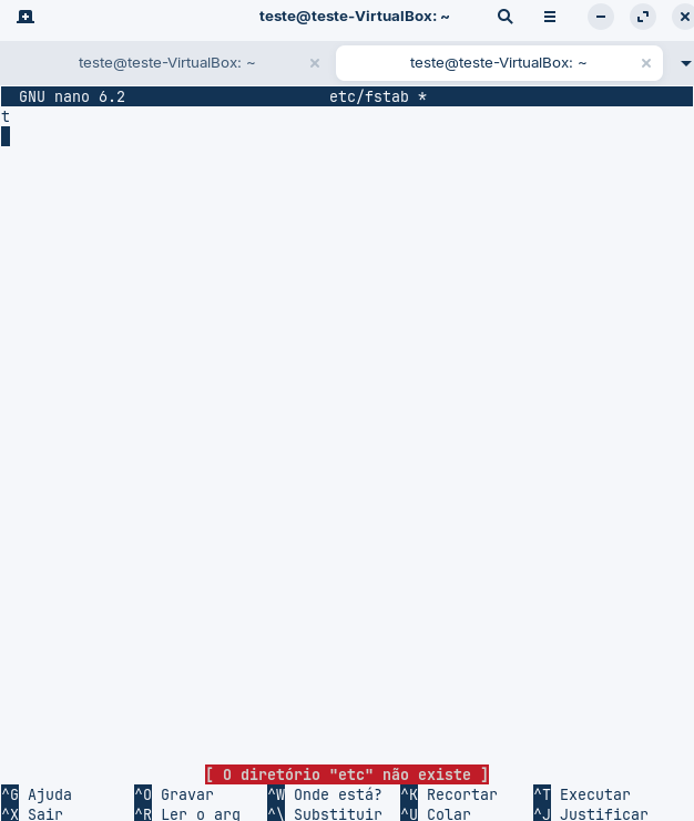 Falta uma barra antes do etc. O caminho correto para o arquivo é /etc/fstab.
