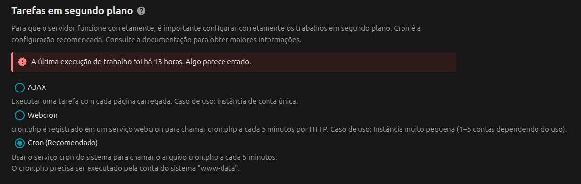 Eu rodo o nextcloud em um contêiner Docker através do CasaOS. Não importa qual eu selecione as tarefas de segundo plano ficam vários dias sem rodar.