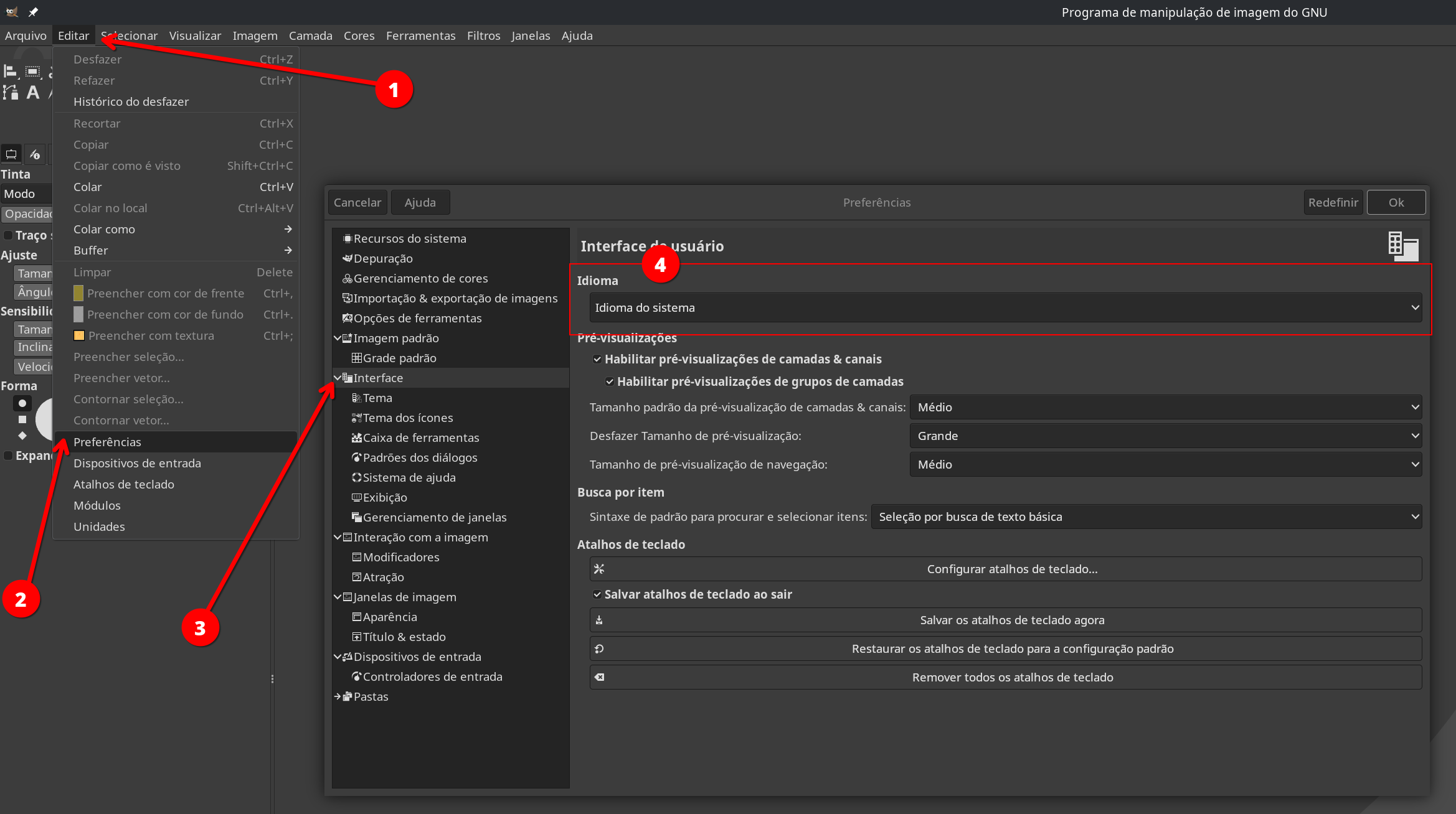 Abra o Gimp, vá em Edit/Preferences. Na tela que vai abrir, clique em Interface e depois escolha português no local indicado.