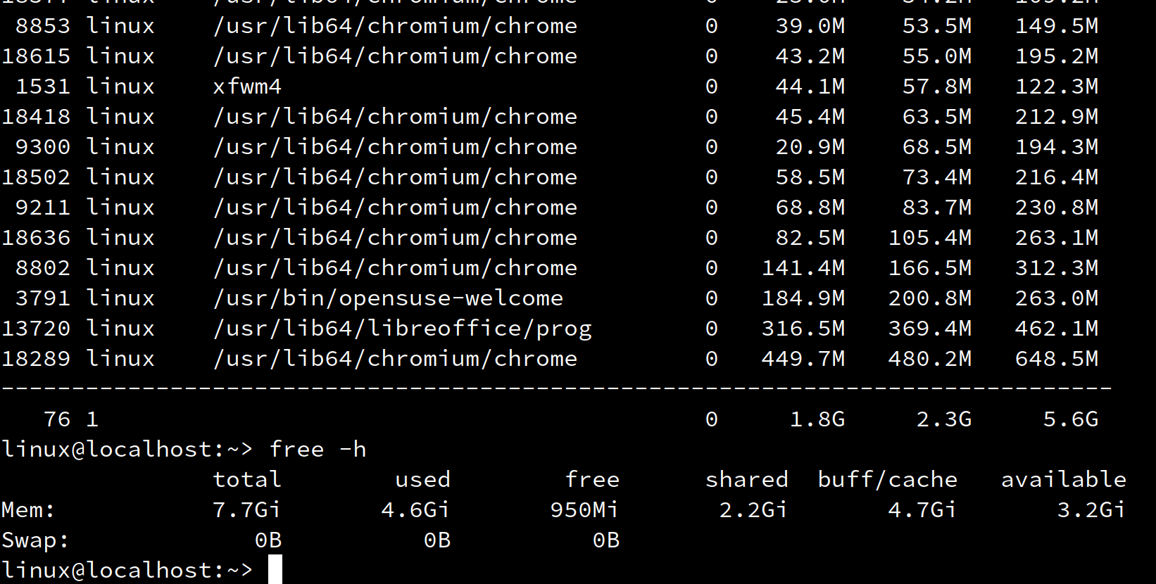 XFCE: total 7.7Gi - used 3.2Gi - free 1.6Gi - shared 715Mi - cache 3.5Gi - available 4.5Gi