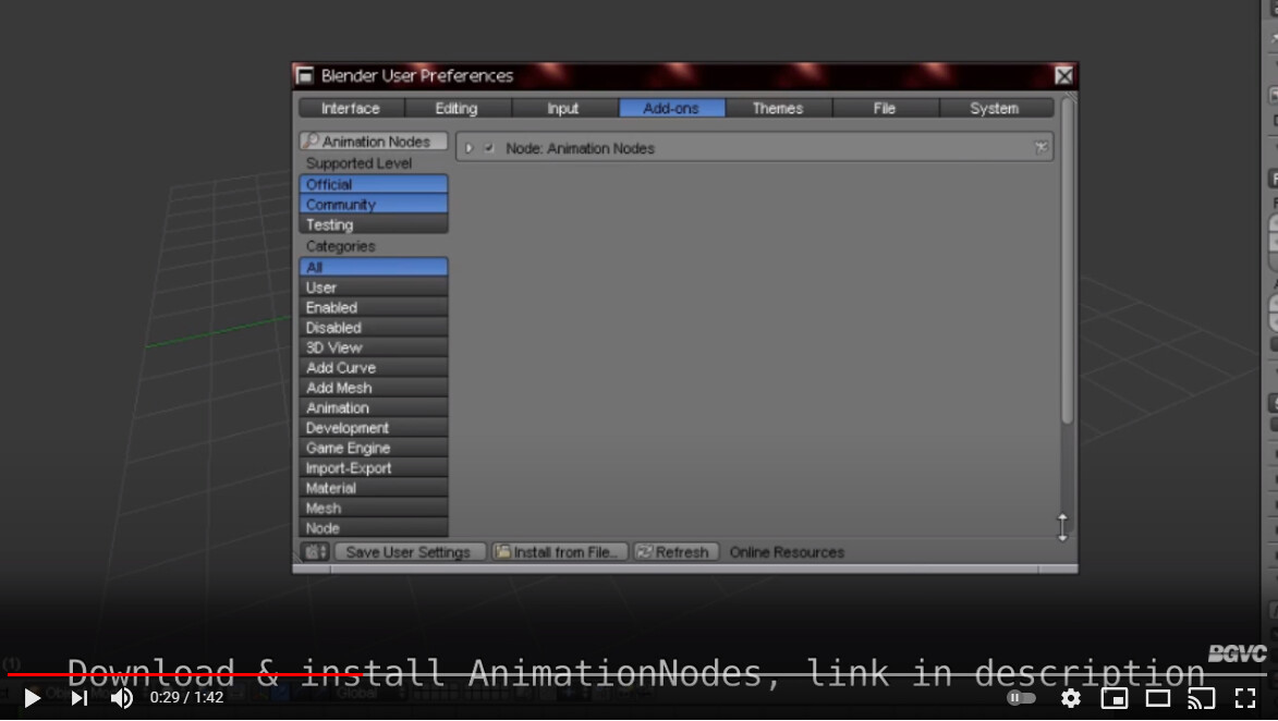 Após instalação basta ativar o animation node marcando a caixinha, depois é só seguir o vídeo, espero que te ajude.