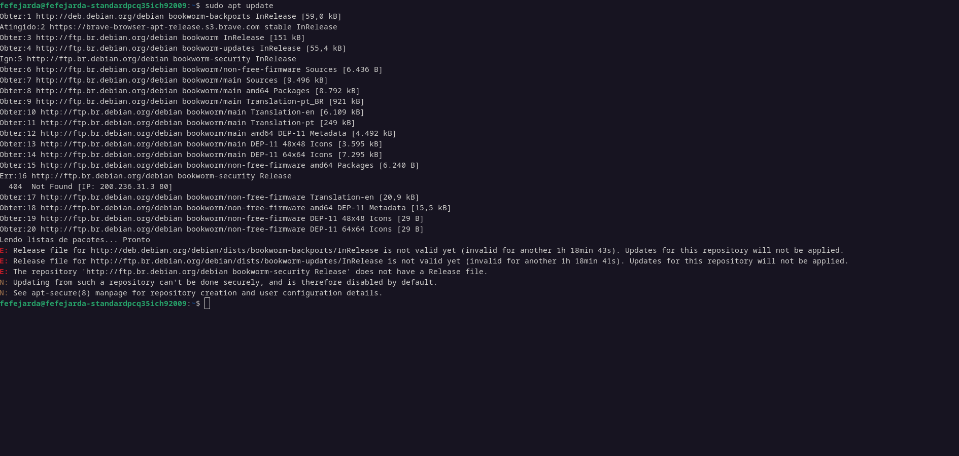 Boa noite pessoal, tudo bem? Alguém que usa o Debian 12 sabe que erro é esse ao tentar atualizar os pacotes do repositório do Debian? Seria algum problema no repositório da distro?