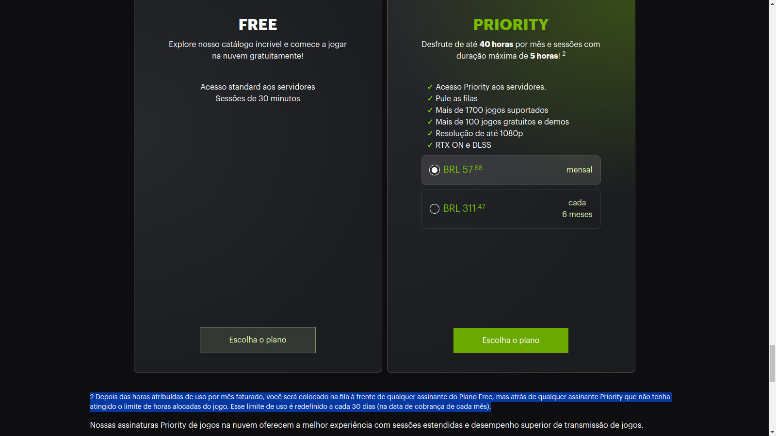 Você vai descendo ate chegar no “escolha o plano”, vai ter 4 planos, o free é o plano gratuito, talvez vc consiga jogar se você tentar fazer login de madrugada, porque de dia a fila é enorme, de dia vc n consegue, ai os outros 3 é prioritário mas pago, ai você pega o que mais combina com vc, eu peguei o mais barato de 40 horas.